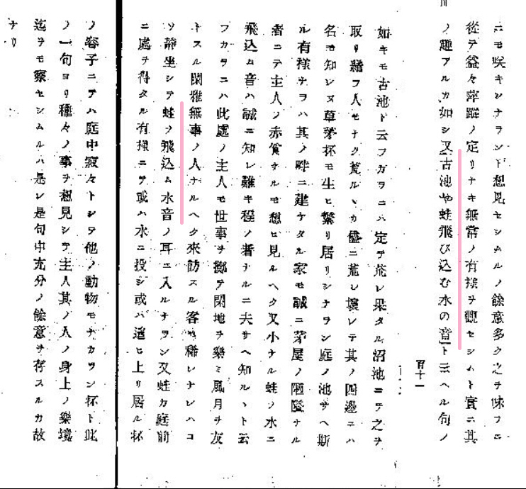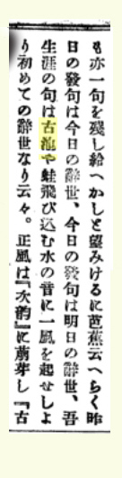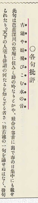 | 古池や蛙飛ひ込む水の音是なり。此際芭蕉は自ら俳諧の上に大悟せりと感じたるが如し。今迄はいかめしき事をいひ、珍しき事を工夫して後に始めて佳句を得べしと思ひたる者も今は日常平凡の事が直に可となることを發明せり。 |