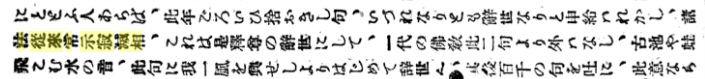 ❹古池や蛙飛こむ水の音 堀成之著「今古雅談」1892年(明治25年) ⑥1732年柳居編集「校正七部集・春の日」と同じ表記 ◆❺❻は正岡子規の新規表記です❺古池や蛙とびこむ水の音 ❻古池や蛙飛びこむ水の音 正岡子規 著「獺祭書屋俳話」 1893年(明治26年)の表記 ❻古池や蛙飛びこむ水の音 「俳諧大要」初出:「日本」日本新聞社 1895年(明治28年)の表記 ❻古池や蛙飛びこむ水の音 ❶古池や蛙飛び込む水の音 正岡子規 「古池の句の弁」 1898年(明治31年)の表記。 ![]() 正岡子規は上記の三つの文書内で、江戸時代にはない新しい表記を二つ行なっています。また、「獺祭書屋俳話」、「古池の句の弁」では、同じ文書内に二つの表記をしています。 江戸時代の「とびこむ」の表記は「飛込」「飛込む」「飛こむ」「とひ込」「とひこむ」「飛込む」です。漢字「飛」に送り仮名を付けません。また濁音「び」ではなく「ひ」と表記します 子規 は、仮名だけでも濁音「び」を用いて「とびこむ」、また漢字「飛」に送り仮名として濁音「び」を付けて「飛びこむ」、として新しい表記を行いました。また「飛び込む」も使用しています。 これらの「ふるいけやかわずとびこむみずのおと」の表記に関して以下の様に纏めます。 (ⅰ)芭蕉が行った「ふるいけやかわずとびこむみずのおと」の各表記は全く気にせずに、江戸時代にはなかった三種の表記を行っています。 (ⅱ)一つの文書内で二つの表記を行なっています。正しいとされる表記はないと言っています。 (ⅲ)昭和16年の辞書でも「とびこみ【飛込み】」としているのに、現在と同じ送り仮名「飛び込む」で表記しています。 (ⅳ)❻「古池や蛙飛びこむ水の音」は現在の小学校の教科書に、❶「古池や蛙飛び込む水の音」は現在の中学校の教科書に採用されています。 (ⅴ)上記❻、❶はGoogle検索で調べた表記の中で、最も使われている表記です。 (ⅰ)(ⅱ)では、子規は俳句には正規の表記はない、その場に適した表記を用いるのが良いと主張しているようです。芭蕉と同じです。しかし、同じ文書内にある二つの表記がその場所での最適な表記であるか否かは読み取れませんでした。同じ文書内で二つの表記を用いた子規の意図が知りたいです。 また、著作権のある現代の俳句ではどのようになっているかも知りたいです。 (ⅲ)俳句の送り仮名について 「俳句入門書」に、俳句では「 名詞には送り仮名を付けず、動詞には送り仮名を付けて、両者を見分けています」とありますが、江戸時代には、「ふるいけや」の「飛込(とびこむ)」のように動詞でも送り仮名を付けていません 「奥の細道」の次の三句では、二句で送り仮名を付けていません。 「行春や鳥啼魚の目は泪」 「田一枚植て立去る柳かな」 「閑さや岩にしみ入蝉の声」 さすがに「田一枚植立去柳かな」では漢文のようになるので送り仮名を付けていると思います。他の二句のように、送り仮名を付けなくとも読み取れる場合は付けないのが普通かもしれません。 明治に送り仮名を統一しようとする動きがありますが、国語調査委員会の「送仮名法」ができたのは明治40年です。 辞書類で調べると 明治22年の日本初の近代国語辞典「言海」では「とびこむ」はなく、「と・ぶ 【飛】」 明治40年の「辞林では、「とび-こ・み 【飛込】 【飛】、【飛込】と送り仮名はないがその時の用途により適当に付けなさいということか否かがわからない。 昭和6年の「辞苑」では「とび-こ・み 【飛込み】と明確に送り仮名が付きます さらに平成20年の「広辞苑」では「とび-こ・み 【飛び込み】として、【飛込み】を除いています。(一部の辞書では【飛び込み】【飛込み】のように二つの表記もあります) 明治26、30年にその時の辞書にもない「飛びこむ」と「飛び込む」の表記を行った子規はさすがです。 (ⅳ)(ⅴ)は後で記述。 尚、「古池や」の論評も抜粋して載せておきます。次の様に書いてます 「見よ、『芭蕉集』中此(かく)の如く善悪・巧拙を離れたる句、他にこれありや。余は一句もこれ無きを信ずるなり。」
