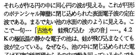 「このサブゼ ミで は、 私の研究の周辺の 表面物理 、メソヌ コ ピッ ク物里 あるい は、 ナノ テ クノロ ジーと言われる分野での最近の トピ ッ クス を平易に紹介する。」 で始まり、「古池や蛙飛び込む水の音」がでてきます。