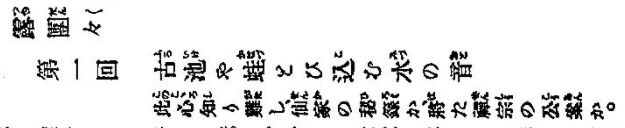 ⓫、⓬と同じ構成で同じ挿絵を使っており、⓯は⓫と同じ表記ですが、⓰古池や蛙とび込むみづの音が新しい表記です。校正の幸田露伴の明治23年の表記は ❶古池や蛙とび込む水の音。その表記の「水」を「みづ」に変える意図がわからない。「みづ」の表記はこれが最初です。