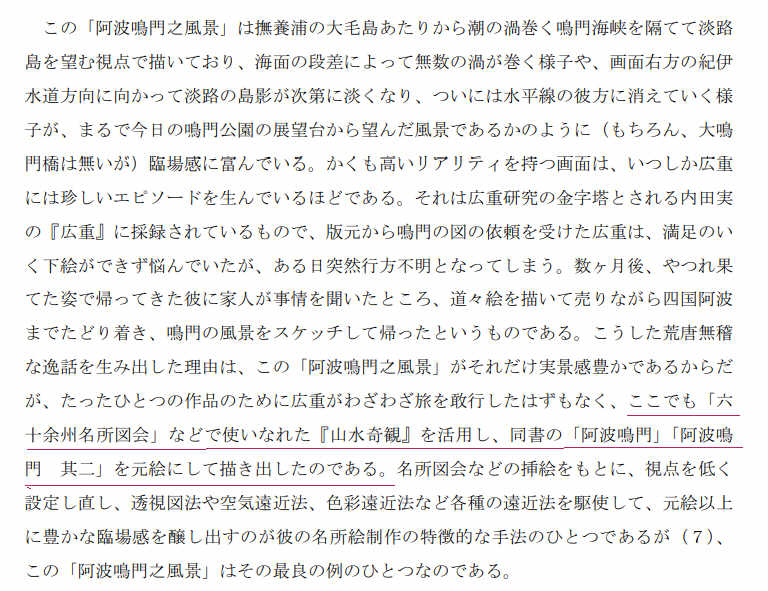 広重は、月と雁が好きなようで切手になった「月と雁」だけではなくいろいろな月と雁を描いています。その一部を示します。月はすべて満月です。 ② 花 「阿波鳴門之風景」 元絵にほぼ忠実に制作 元絵は「山水奇観 阿波の鳴門」で、その画とほぼ同じ構図で制作。「花」は鳴門の渦巻きです。 元絵を使い実景感豊かな風景画を制作。歌川広重、淵上旭江共画と認識して作品を眺めてもよい。 ![]() 歌川広重 「阿波鳴門之風景」 ![]() 阿波鳴門之風景の花(渦巻)と島の部分。 阿波鳴門之風景 | 慶應義塾大学メディアセンター デジタルコレクション ![]() 元絵とされる淵上旭江「山水奇観 阿波の鳴門」 (1800年) 広重「阿波鳴門之風景」とほぼ同じ構図ですが、渦巻はない。 山水奇観 前編4巻後編4巻. 3 14-15/27 -国立国会図書館デジタルコレクションより引用 ![]() 北斎漫画「阿波の鳴門」 渦巻はこの図を参考にしたか 北斎漫画七編 7/34- 国デジより引用 「写真をなして是に筆意を加ふる」 「山水奇観 阿波の鳴門」により「写真をなして」、広重がこの渦巻きにより「筆意を加ふる」ことにより「阿波鳴門之風景」が完成 上記の文献から、「阿波鳴門之風景」(1857年)以前の作品を表示します。 ■1796年に徳島藩の御用絵師、鈴木芙蓉の「鳴門十二勝景図巻」(1796年) ![]() 鈴木芙蓉 裸嶼望門先 ![]() 鈴木芙蓉 大毛山望鳴門 鳴門十二勝景図巻(1796年) 鳴門十二勝景図巻(なると じゅうに しょうけいずかん):徳島市公式ウェブサイト ■この後、1802年に上記の淵上旭江「山水奇観 阿波の鳴門」が描かれる。 ■1814年に探古室墨海の阿波名所図会 鳴門真景」 渦が描かれています。北斎漫画の渦と共に広重が参考にしたかもしれません。 ![]() 阿波名所図会 探古室墨海 阿波名所図会 上 7/22-早稲田大学図書館 ■1836年に仙台藩士で絵師の小池曲江の「莫逆閑友 阿波鳴門図」。「山水奇観 阿波の鳴門」とほぼ同じ場所から、同じ構図。 ![]() 莫逆日閑友 阿波鳴門図(1836年) 函館市中央図書館所蔵デジタルアーカイブ ■1835-1854年に藩の御用絵師、守住貫魚の「鳴門真景図」絹本著彩)。「山水奇観 阿波の鳴門」とほぼ同じ場所から、同じ構図。 ![]() 守住貫魚筆 鳴門真景図 絹本著彩(1835-1854年) 鳴門真景図(なると しんけいず):徳島市公式ウェブサイト これらの作品が広重の「阿波鳴門之風景」制作に集結されます。 元絵の「木曽路名所図会 馬籠から妻籠にいたる」を大胆に改変して壮大な雪景色を創っています。ここまで改変すると、元絵との関連など考えず、作品を眺めます。広重しか描けない作品です。広重の最高傑作と思っています。 ![]() 歌川広重 木曽路之山川 ![]() 木曽路之山川の集落と人物の部分。この山川の雪景色の中に村人が生活しています。 木曽路之山川 | 慶應義塾大学メディアセンター デジタルコレクション ![]() 木曽路名所図会 馬籠から妻籠にいたる 木曽路名所図会 三 10/53 -早稲田大学図書館