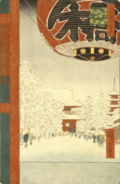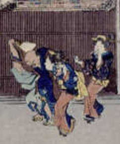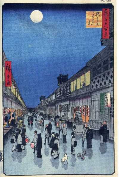 ■広重「浪花名所図会」「堂じま米あきない」 の元絵は、「摂津名所図会」の「堂嶌穀糴糶」 大阪の堂島米会所(どうじまこめかいしょ)は江戸幕府公認のお米の取引所でした。その熱い取引の様子を描いたのが、歌川広重の「浪花名所図会」シリーズの「堂じま米あきない」です。 ところで、柄杓を持った人たちは何をしているのでしょうか。 ![]() 広重「浪花名所図会」「堂じま米あきない」 浪花名所図会 堂じま米あきない - 国立国会図書館デジタルコレクションより引用 ![]() 『摂津名所図会』巻之四に載る「堂嶌穀糴糶(どうじまこめあきなひ)」 大日本名所図会. 第1輯第5編摂津名所図会 247/380- 国立国会図書館デジタルコレクション 柄杓を持った人たちはタイムキーパーでした。 「江戸幕府が公認した、大阪生まれのこの取引の仕組みと知恵は、日本国内にとどまらず、世界の商品取引所の先駆けとなったとされています。しかも堂島では、現在にも通じる先物取引がすでに存在していました。即ち「投機筋からリスクヘッジまで」行われていたので、当然取引はヒートアップします。 取引は時間を厳格にするために、「2寸(約6センチ)の火縄に火をつけて、燃え終わるときが終了時間」と定められ、取引の正当性、明確化が維持されていました。 終了時間をとっくに過ぎても売買を続ける、その燃え盛る熱気の中に登場するのが水方役さん。鉢巻まいて、着物の裾をはしょって、手桶を片手に勢いよく水を掛け、撒いています。現れた8人の〝水掛部隊〟は、取引所の職員さんです。この水方役さんたちが、勢いよく柄杓で水を掛けると、取引は強制終了。彼らは市場の正確なタイムキーパーを務めていたのです。」 『摂津名所図会』では、線と点で勢いよく水が描かれていますが、広重「堂じま米あきない」 では、水が描かれていません。この作品で最も重要となる、まかれる水が描かれていないのが不思議です。印刷される版の違いと思い他の版も見ましたが水は見えませんでした。空白部が少し白くなっているのがまかれた水でしょうか。 ![]() ![]() ■広重「浪花名所図会」「道とんぼりの図」 の元絵は、「摂津名所図会」の「道頓堀芝居側」 「道頓堀芝居側」が俯瞰で描いているのに対し、広重は芝居小屋の立ち並ぶ風景をやや大きく遠方に描き、多くの職種の人物が行き交う橋を前面に大きく据えた構図に変更しています。 ![]() 広重「浪花名所図会」「道とんぼりの図」 浪花名所図会 道とんぼりの図 - 国立国会図書館デジタルコレクションより引用 広重は、「道頓堀芝居側」のこの部分を、橋の上の視点から「道とんぼりの図」に描く ![]() ![]() 「摂津名所会」巻之四「道頓堀芝居側」 大日本名所図会 第1輯第5編摂津名所図会 摂津名所図会. 上,下巻 - 国立国会図書館デジタルコレクション より引用 7.2 広重作品を元絵とした作品