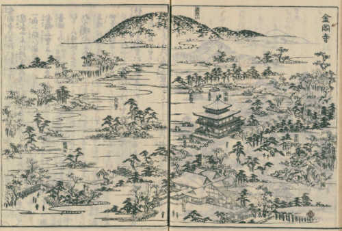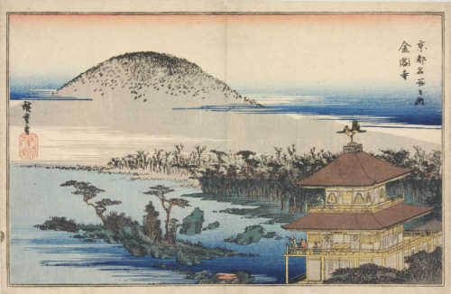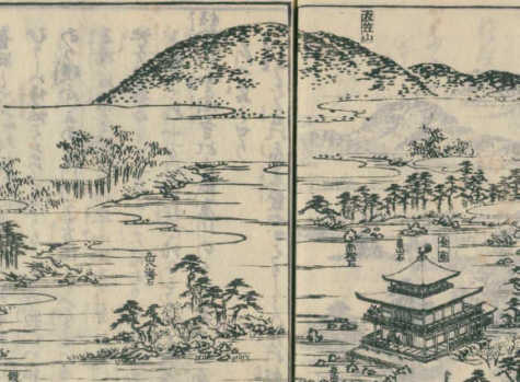 『都名所図会』(安永 9 年/1780 年)の「金閣寺」の金閣寺と衣笠山の部分を切り取り、縦部を圧縮し、衣笠山を小さくして左に移行し、金閣寺を大きく描くと、広重「京都名所之内 金閣寺」になります。