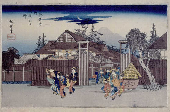 竹原信繁 画「都名所図会」の「島原」の右側の部分を切り取り、左上に有った月を中央に移行し、手前の建屋を高くすると、構図は広重「京都名所之内 嶋原出口之柳」とほぼ同じになります。 門構え、柳、三日月などは「都名所図会」から取り込んでいます。何故か、三日月が明けの三日月になっています。 広重「京都名所之内 嶋原出口之柳」の門外の人物4人は、「都名所図会」の門内の人物4人を参考に描いています。