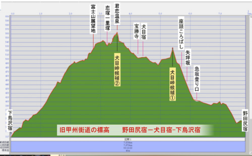 野田宿-犬目宿-下鳥沢宿の間で、登り下りのある坂道の一番高いところが犬目峠候補地になります。標高図を見ると地図に記載したニ箇所が犬目峠候補地になります。
