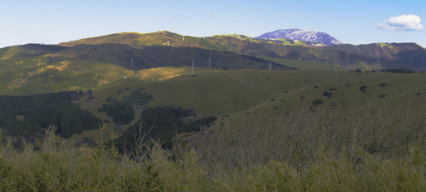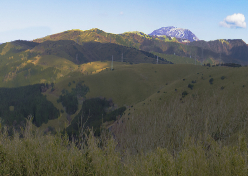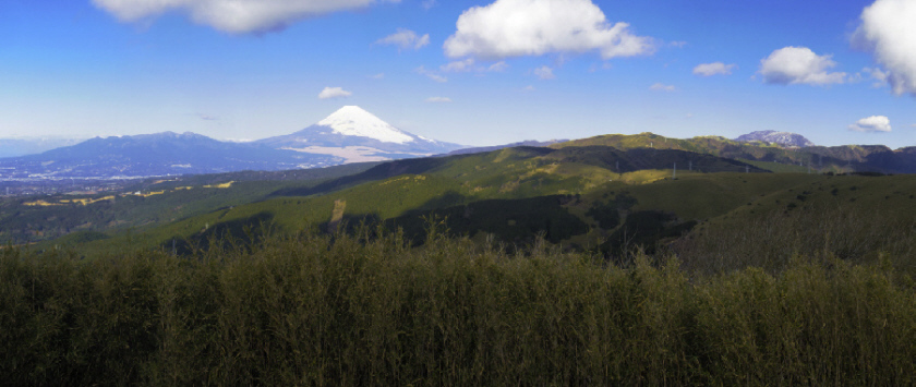 1 葛飾北斎画「豆州日金山眺望絵巻(部分) 肉筆」と実景図図11に、「富嶽三十六景」で有名な葛飾北斎の「豆州日金山眺望絵巻(部分)」 を示します。日金山山頂丸山からの富士山で、,左右にまだ景観図があるようです。 実景から「豆州日金山眺望絵巻(部分)」を描いた過程を検討します。作品には地名の書き込みが有り、左端は久能山、右端は足柄〇」です。 十国峠(日金山)頂上から、図11の描いた範囲の写真を図12、カシバード画像を図13に示します。 図11北斎作品は、図12実景写真、図13実景のカシバード画像に比べると、大まかな構図、雰囲気は似ています。しかし、、図11北斎作品は縦方向に長く、富士山の位置も右側にあります。北斎の制作過程を追跡します。 ![]() 図12 十国峠(日金山)頂上からの写真 ![]() 図13 十国峠(日金山)頂上からのカシバード画像 2 実景から「豆州日金山眺望絵巻」へ(1)図11と富士山の高さが同じになるように、図13の拡大した画像を作りそれを縮小率55.2%で横幅を圧縮します。富士山などそれぞれの箇所は図11に近づいてきました。しかし、当然富士山の位置が違います。そこで富士山の位置が合うように次に進みます。 ![]() 図14 図13のカシバード画像を拡大して、横幅を55.2%圧縮した画像 (2)図13の拡大した画像を縦方向に三分割して横方向に61.4%、55.2%.47.4%に圧縮します。 図14の55.2%の中央部の富士山の画像を図11の富士山にあわせて、残りの画像を空いた空間に合うように横幅を変えると左側は61.4%、右側は47.4%になりました。 ![]() 図15 図12のカシバード画像を拡大して、横幅を61.2%、55.2%、47.2%圧縮した画像