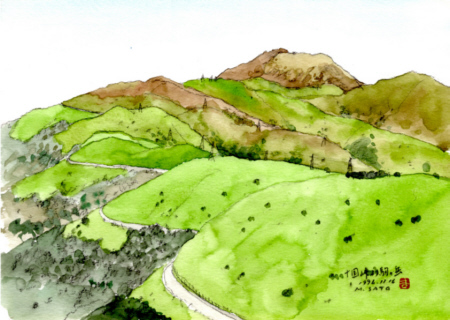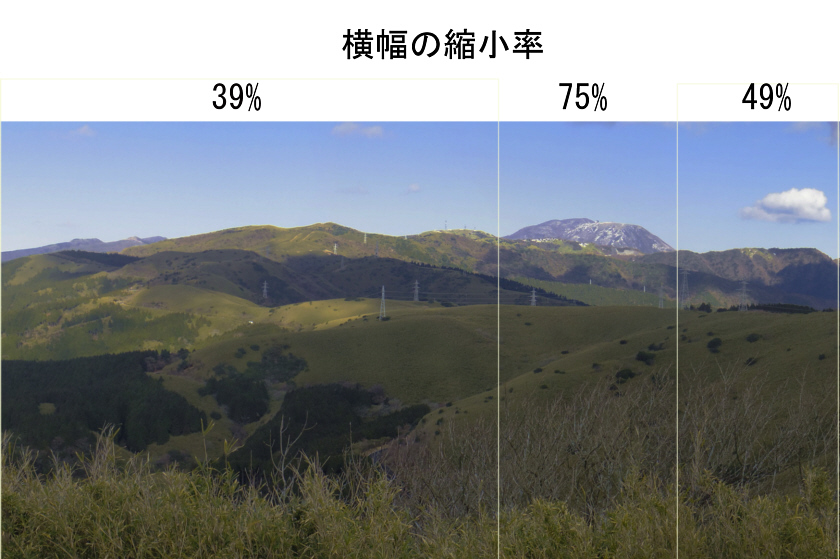 | 正昭画「十国峠より駒ヶ岳 1996.11.16」 | 実景を縦に三分割して、横幅を39%、75%、49%に圧縮した図 |