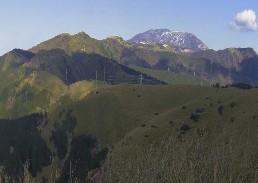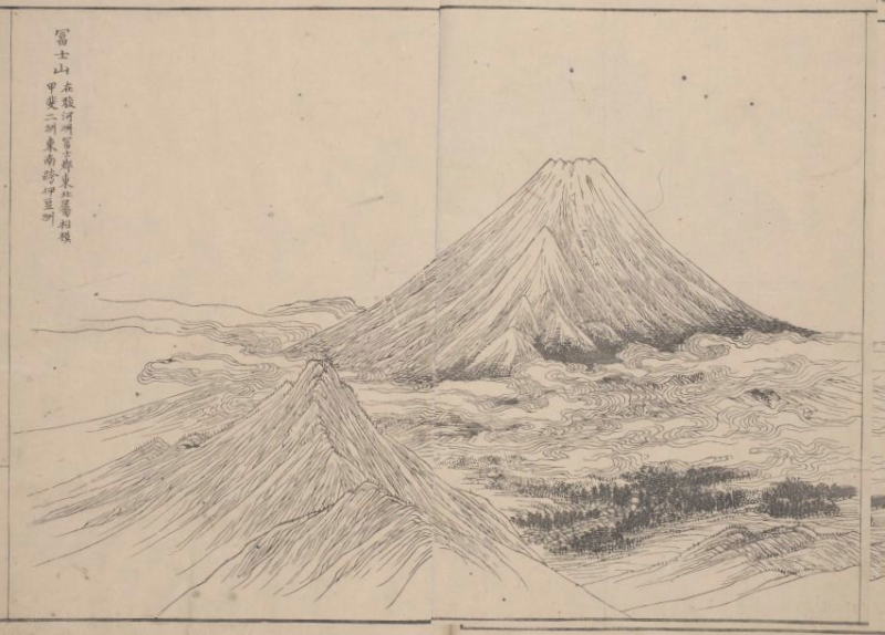 (3)次に手作業で ❶富士山の頂上を図12に合わせて削ります。(前に富士山と同じ高さと書きましたが、削る分だけ高くしています) ❷左の駿河湾を拡大します。 ❸全体の色調をほぼ灰色にします。 ❹輪郭線を描きます。空に雲を浮かべます。実景から作成した最終版の図16ができました。 同一画面で見るため図11葛飾北斎画「豆州日金山眺望絵巻(部分)を再掲しました。 実景を縦方向に三分割した部分の横幅圧縮という意外と簡明な工程で、北斎作品に似た作品が出来上がりました。 三分割して縮小率が異なるのは次の様に推察します。北斎は、この絵の三大ポイントは富士山、足高山、コマガタケであるとして、コマガタケの位置を富士山に近づけるため、右側の縮小率を小さくした。 ![]() 図16 図15に各種手入れした最終版 ![]() 図11 葛飾北斎画「豆州日金山眺望絵巻(部分)」再掲 (4)次に富士山の形状を見ると、図11葛飾北斎画「豆州日金山眺望絵巻」の富士山は実際の富士山の富士山に比べて次の点が異なります。 ❶山頂部が広くなっている 横幅を圧縮すると山頂部がとんがり帽子みたいにななります。図20のように山頂部を削ると落ち着いた富士山の形状になります。ここで作成した図16も山頂部を削っています。他の違いは訂正していません。 ❷実際の富士山の左側傾斜が図17、図18、図19のように二段階になっているが、一段階の傾斜です。 この方向からの富士山は、中腹から左側の傾斜が大きくなるのが形状の特徴です。北斎画では滑らかな傾斜に描いています。 ❸富士山左側の山体が、右側より長い 図21の実景の富士山は、右の傾斜が長く富士山が左から右に流れている印象を与えます。北斎画では、全体の景観は富士山、足高山、駿府の山々と右から左に流れています。それに合わせて富士山本体も右から左に流れるように、左のすそ野を長く滑らかにしたと推察します。 ❸宝永山が独立した山のように描いている 実景では宝永山の周辺だけが盛り上がっていますが、北斎画では独立した山のように下のすそ野まで盛上りが続いています ここで、この部分を宝永山としましたが北斎が宝永山を描くの珍しいらしいことです。「富嶽三十六景」では一枚も描いていません。富嶽百景の《 (宝永山出現)其二 》で描いているだけかもしれません。【みんなの知識 ちょっと便利帳】葛飾北斎・富嶽百景/富岳百景《(宝永山出現)其二》 (benricho.org) これらの実景と異なる北斎画の富士山は、図22谷文晁【名山図譜 富士山】の富士山を元絵にしたように思います。 富士山山体の形状、山体の沢など凸凹、宝永山、山頂部の描き方がとても似ています。 谷文晁【名山図譜 富士山】は文化二年、1805年刊で、葛飾北斎画「豆州日金山眺望絵巻」は天保4年、1833年刊です。28年前に刊行された【名山図譜 富士山】は北斎も入手して参考にしたと思います。 【名山図譜 富士山】には何処から描いたかは記載されていませんが、中央左の山腹にある突起が宝永山とすると、日金山の方向から描いた富士山です。しかし、前景は実景とは異なります。