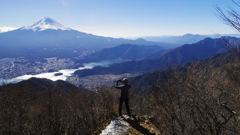 御坂黒岳の展望台は10人ほど休憩できる所があり、その下側に出っ張った岩場があります。その岩場で私は撮影した後、相棒さんが、足を踏ん張って樹木の枝を避けて富士山を撮影します。その下は急峻な崖で、写真で見ると結構危ない展望台です。当日は他に2人しかいませんでしたが、混み合う時の撮影は順番待ちになりそうです。