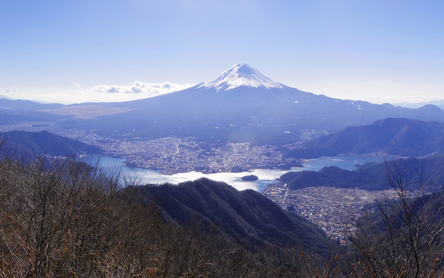 1 2014.12.27の御坂黒岳の山歩きで「黒ちゃん」を見た。 大月駅から、バスで三ツ峠入口に行き御坂峠を経て御坂黒岳山頂に登り、そこから200m先にある黒岳展望台から富士山を眺めた。 河口湖を前景に富士山の左右の裾野がなだらかに拡げがって行き、その先の左側は道志、箱根の山並、右側は御坂山地、南アルプスが続く。静寂な雰囲気の中に、威風堂々とした富士山が聳えています。絶景です。 左のすそ野はなだらかに流れていくが、右の裾野は五合目あたりから大室山まで寄生火山の凸部が連なっていて、その対照的な形状が面白い。山頂から左側に吉田大沢が流れていき、小御岳がほぼ中央にあり、グイと富士山の中腹部を盛り上げています。河口湖中央の島は、うの島(鵜ノ島)。無人島で通称「島の弁天」が祀られています。その周りの水面が陽光を反射して白く光っています。
