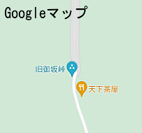二つの御坂峠が登場します。 「西の御坂峠」の御坂茶屋は2013年には休業中ですが、2017年は「御坂茶屋跡」になっています。 ![]() 図33 昭文社 山と高原地図25 大菩薩嶺 2017年版 (図7と同じ。再掲) (3)Google マップ (Webサイト) Googleマップの「東の御坂峠」付近を見ると、御坂隧道の富士河口湖町側の「東の御坂峠」に「天下茶屋」が出てきます。その地図を拡大していくと、図34のように、天下茶屋の左上に「旧御坂峠」が出てきます。 この「東の御坂峠」を「旧御坂峠」として、「西の御坂峠」を「御坂峠」としている地図は、Googleマップとヤマケイオンライン / 山と溪谷社の地図だけです。。この「東の御坂峠」は、「西の御坂峠」の後に出てきた峠ですので、「旧御坂峠」とする理由はありません。このGoogleマップの「旧御坂峠」は、記載ミスと思います。 Google マップを使い旅行記を書いているサイトもあるため、この記載ミスがネット上で「御坂峠はどこ」、「旧御坂峠はどこ」の混乱を進めています。 (4)YAHOO地図(Webサイト) 図35のYAHOO地図の御坂山周辺の地図では、「西の御坂峠」を「御坂峠」として、「東の御坂峠」を「天下茶屋」とてしています。 図36のゼンリン地図・いつもNAVIの御坂周辺地図では、「西の御坂峠」を「御坂峠」として「東の御坂峠」には記載がありません。国土地理院地図と同じです。