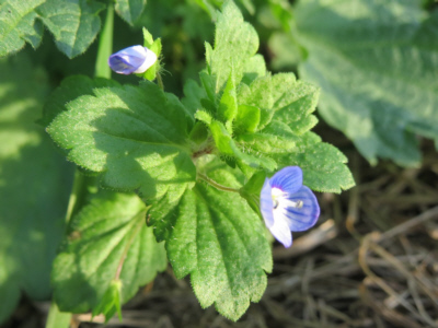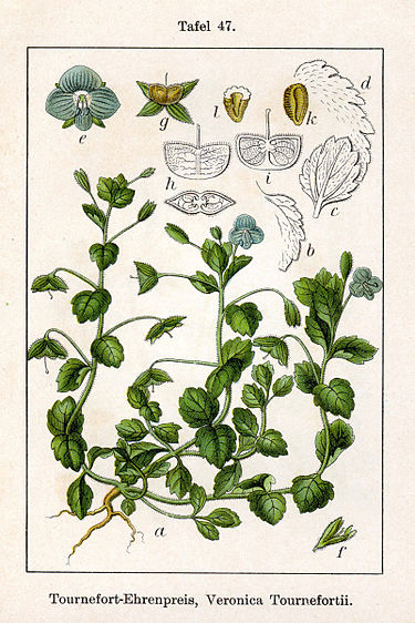 ①発見した植物は「Veronica persica Poir 」 牧野 富太郎がお茶の水で発見した帰化植物をしらべたら、学名が「Veronica persica Poir 」というクワガタ属の植物であることがわかりました。 また、日本の在来種でVeronica persica Poirと同じ分類の「クワガタソウ属」の植物として「イヌノフグリ」があることがわかった。その葉や茎の姿はVeronica persica Poirと似ている。しかし、「イヌノフグリ」の花は淡いピンク色でVeronica persica Poirの花はコバルトブルーで似ているとは思えない。では「イヌノフグリ」の名前の基になった実の形はどうか。 「Veronica persica Poir」を発見した時が春なので、その時は確認できないが、植物書を調べればわかります。1779年発行の植物書にVeronica persica Poirの画像があり、「g」にその実が描かれています。 ![]() Veronica persica Poir., syn. Veronica tournefortii C. C. Gmel. non Vill. 1779, nom. illeg. オオイヌノフグリ-ウィキペディアより引用 『ウィキペディア(Wikipedia)』では、二冊の引用書物を示してオオイヌノフグリの果実はハート型で、犬のフグリに似てはいないとしています。 しかし、上図の実の画像及び上表の実の写真は、両方とも「イヌの陰嚢」に似ていると見えます。 牧野富太郎も、上記した「牧野富太郎 植物記1 野の花1」の図33で「オオイヌノフグリの実(犬のいんのうに似ている)」と書いてますので。「Veronica persica Poir」の実も犬の陰嚢に似ていると確認したと思います。 Veronica persica Poiと「イヌノフグリ」は、実の形も含めて「外見」は似ており、「分類」は界から亜属まで同じ分類になっています。 しかし、それらが似ており、其の姿が「イヌノフグリ」より大きいからといって、それだけで「オオイヌノフグリ」と名付けるとは思えません.。帰化植物に在来種の名前にちなんだ名前を付ける必要はないと思います。 Veronica persica Poirと言われた花のイメージは青い可憐な花が咲き、「オオイヌノフグリ」の名前のイメージは違いすぎます。 ②Veronica persica Poirの別名 「聖ベロニカの花」 Veronica persica Poirは、下記の言い伝えから「聖ベロニカの花」と言われ、花言葉は「神聖、清らか、忠実、信頼」です。 コバルトブルーの清らか花の印象にぴったりです。通常では、Veronica persica Poiの和名に、これらに関する植物名を付けたくなります。