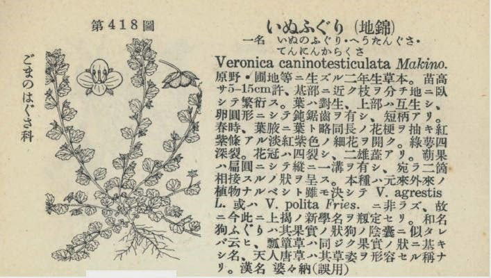 「天人唐草」 天女のように高貴で美しい唐草か。検索では山岸凉子による日本の漫画が多くでてきます。天人唐草 - Wikipedia 「星の瞳」 千葉県で「オオイヌノフグリ」の別名としてあるようです。.(. | レファレンス協同データベース) 青い可憐な花は、天上に輝く星のようです。英語名はBird's Eye(鳥の目)、あるいはCat's Eye(猫の目)ですが、いずれもそのきらめきを「瞳」に例えたのでしょう。 牧野 富太郎も。上記の「原色帰化植物図鑑」で「まだ見たこともないコバルト色の花が土手一面に咲いており、まるで満天の星を見るようだった」とあります。牧野 富太郎の最初のイメージは「星の瞳」に近かったようです。 俳人高浜虚子はいぬふぐりで二句読んでいます。俳句のいぬふぐりは、オオイヌノフグリを指しており春の季語です。 いぬふぐり星のまたたく如くなり 水際まで咲き拡がりし犬ふぐり しかし、満天の空にまたたく星のような花に、24歳の牧野富太郎は「オオイヌノフグリ」と名付けました。 ③「オオイヌノフグリ」の名前の世間の評判 江戸時代ではイヌフグリの名の植物書が多い。江戸時代ですから、かえっておもしろい名前として定着したかもしれません。 『本草図譜』岩崎灌園では「仙人草(せんにんさう)」として、別名に いぬのふぐり(京) たむしづる へうたんぐさ(江戸)とあります。 牧野 富太郎が「オオイヌノフグリ」と命名した明治20年頃の評判は、不明です。 昭和のはじめの頃は、ある学者がイヌノフグリという名は教育上けしからんといって、この草の名をハタケクワガタに変えようと言いだしましたが、ついに変えることはできませんでした。 しかし、文化勲章を受けた詩人の草野心平が昭和21年に書いた「春のうた」の一節に「いぬのふぐり」が出てきます。 ほっ いぬのふぐりがさいている。 ほっ おおきなくもがうごいてくる この詩で「いぬのふぐり」は春の花の代表になっています。そして、遅くても2013-2021年の小学校4年生の教科書に掲載されています。戦前、教育上けしからんとい言われたイヌフグリが戦後春の花の代表として小学校の教科書に載っています。 その説明文には、それによって詩全体の雰囲気が違ってくるからか、「おおきなくも」が「大きな雲か「大きな蜘蛛」かの検討が多いです。 しかし、何故か「いぬのふぐり」の由来になった実と犬の陰嚢の関係についてはほとんど記載がなく、残念です。 草野心平「春のうた」/7聖徳大学附属小学校 ・・全文 茨城大学教育実践研究 32(2013), 1-15-草野心平「春のうた」の解釈と授業実践。。論文 上記したように高浜虚子(1874〜1959年)の俳句以外でも、いぬふぐりは春の季語として俳句に多く使われています。 俳句のサロン-歳時記(1998-2012年)の「いぬふぐり 1」、 に100句、「いぬふぐり 2」に167句あり、とても人気のある春の季語です・ 陽は一つだに数へあまさず犬ふぐり 中村草田男 真先に笑ひかけしは犬ふぐり 小山徳夫 馬とびの馬のつぶれて犬ふぐり 小沢昭一 一帯は激震の跡犬ふぐり 安原葉 上条恒彦が「いぬふぐり」という曲を出してます。 さて、上条恒彦氏ですが1996年に自主制作のCDアルバム「冬の森で」をリリースしています。当時新聞に取り上げられた記事を見て購入しました。このアルバムの中にも「だれかが風の中で」が収録されています。CDアルバム「冬の森で」収録曲の1曲目がすずきみちこ氏作詞作曲の「いぬふぐり」という歌です。これも反戦歌です。全盛期の声に比べるとやや枯れた声で上条氏が歌っています。「丘は今も柴山 いぬふぐりが咲いている」。聴いた瞬間に引き込まれると言うほどの曲でもないのですが、共に素朴で力強い詞と旋律がいつの間にか心にしっかり納まっています。歌曲と言う範疇には入らないのかもしれませんが、歌い継いで行きたい曲の一つです。 歌手 上条恒彦 歌 「だれかが風のなかで」 「いぬふぐり」 - 生涯を完結させるまでに歌いたい歌、最近始めたヴァイオリンとフルートはどこまで演奏できるようになるか、と時々ワンコ 現在、各サイトでの「オオイヌノフグリ」の名前の評判は、公で話題にしにくい、青く可憐な花に不憫、無粋、下品な名とあまり良くないようです。 現在の「オオイヌノフグリ」の名前の評判は、分野、見る人により評価が分かれている状況と思います。 ④牧野 富太郎が、お茶の水で発見した外来植物を「オオイヌノフグリ」と命名した理由 お茶の水で発見した外来植物の学名が「Veronica persica Poir 」で「聖ベロニカの花」といわれており、コバルト色の花が土手一面に咲いており、まるで満天の星を見るようだったと書いているのにその花を「オオイヌノフグリ」と命名した。 牧野富太郎は、「イヌフグリ」の和名が気に入っており、それを使いたいためにお茶の水で発見した外来植物を「オオイヌノフグリ」と命名したと推察します。 命名した後の評判は気にしなかったと思います。 「イヌフグリ」の和名が気に入っていた事由(その1) 「