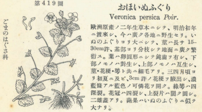 発見年が1884年で発見場所が上野公園と「牧野富太郎 植物記1 野の花1」と異なりますが、牧野富太郎が発見者として記載されています。 環境省の侵入生物データベースは「原色帰化植物図鑑(保育社刊行)」方を採用しています。 上記2件で、「オオイヌノフグリ」の発見者が、牧野富太郎でそれにより「オオイヌノフグリ」と命名したと推察されますが、二冊の本に「命名者は牧野富太郎」の記載がないこと、発見年と発見場所が異なること、が気になります。また、下記に示した1940年刊の牧野日本植物図鑑では、「おほいぬのふぐり」は明治初年に渡来したと書いてます。明治初年は明治1~10年と考えると上記二件とも異なり、「オオイヌノフグリ」の発見者ははっきりしません。 「オオイヌフグリ」の命名者を「牧野富太郎 」と確定するには、発見の記事が載った植物学雑誌の全文を見ることが必要です。。