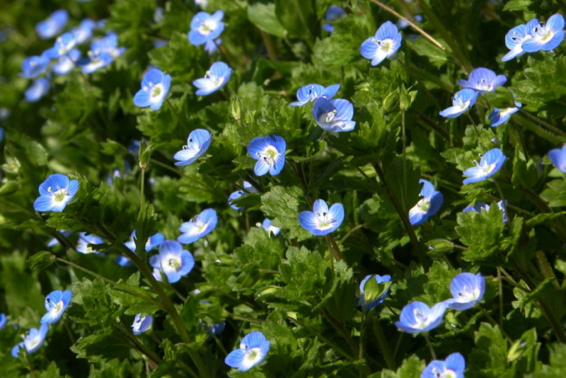 また、「オオイヌノフグリ」に後からつけられた日本の別名に、「瑠璃唐草」、「天人唐草」、「星の瞳」があります。このような名前が、命名する時に何故出てこなかったのか不思議です。 「瑠璃唐草」 江戸時代には帰化植物のことを「唐草」と言ったそうですから、「瑠璃唐草」とは「渡来した瑠璃色の花」という意味。 「瑠璃唐草」は、今ひたち海浜公園みはらしの丘に植えられて人気があるネモフィラの別名でもあります。オオイヌノフグリとよく似ています。分類はムラサキ科です。 葉の形が唐草模様に似ていることから、和名ではルリカラクサ(瑠璃唐草)と呼ばれる。 「オオイヌノフグリ」ではなく「瑠璃唐草」と名付けていたら、この花がひたち海浜公園みはらしの丘を青く染めていたかもしれません。