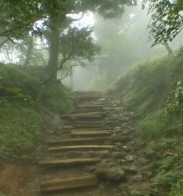 「不二三十六景 相模大山来迎谷」の左側の断崖絶壁を取り除いて、丹沢山地と思われる山並みを追加し、鳥居下に参詣道を描いた図を作りました。 ![]() 更に、富士山を実際に見えている形状に直すため、縦方向だけを60%に縮小しました。鳥居下の参詣道も少しなだらかになり、これなら登ってこれそうです。山の斜面もなだらかになり鳥居上の参詣道を登るとすぐに山頂の石尊宮に到着する雰囲気になりました。この画像で、「来迎谷」を描いた場所を探します。 しかし、現在の登山道で、このように鳥居が見えて富士山が見えるところはありません。 富士山と谷が見えるところは探したので、その場所で鳥居と急坂の参詣道が見えるところを探します。 ![]() 5.2 鳥居の見える登山道を探す-二十七丁目御中道 「谷」探しで掲示した画像を再掲します。現在の登山道で鳥居のあるところは27丁目「御中道」です。急な坂道の上に鳥居があります。 ![]() 鳥居の上に27丁目「御中道」の石柱があります。鳥居の左側に山頂裏に行く細い道があります。この道が江戸時代のご中道と思います。 右側は柵があり道がありません。 ![]() 大山27丁目「御中道」鳥居の上からのgoogleマップのストリートビューの映像です 登りの登山道は尾根の中央が掘られた形状になっています。掘られていなければ尾根の一番高いところになります。その登りの道はかなり岩が多い急坂です。高齢者には、最後のひと踏ん張りと思い登る坂道です。 「石尊山来迎ヶ谷」で描かれた登る参詣者と鳥居で迎える参詣者の気持ちがわかります。また、鳥居の下は階段になっていますが、御中道の中心地ですのでもう少し広い平坦地になっていたと思います。 ![]() 明治・大正時代のご中道と鳥居を絵葉書で見ます。 大山絵葉書御中道参照 現在の二十七丁目御中道と同じところに、同じ鳥居があります。鳥居の下が写っていないので、上り道の凹部の状態、樹木の伐採の状況はわかりません。 ご中道はかなり広い道もあり、樹木の伐採はかなり行われていたようです。そのご中道から富士山が見えています。また、親不知と呼ばれるところには高さ5m以上の大岩もありました ■『大山本宮鳥居前 Before The Entrance To The Main Shrine. (Oyama, Sagami.)』 出版年撮影日等:明治40(1907)年4月~大正7(1918)年3月 現在の鳥居は明治三十四年東京「銅器職」講中寄進の鳥居ですので同じ鳥居のようです。この鳥居の左側が御中道の出発地点です。 ![]() 相州大山 阿夫利神社 本社』 出版年撮影日等:明治40(1907)年4月~大正7(1918)年3月 ![]() 『相刕大山名所 頂上御中道』 出版年:昭和8(1933)年~ 昭和20(1945)年 、この場所は鳥居付近の南部の御中道と考えます。 ![]() 5.3 鳥居の見える登山道を探す-江戸時代の二十七丁目御中道 現在、明治、大正時代にあった鳥居と御中道が江戸時代にあったか否かを調べます。 鳥居と御中道のある山内図御中道を再掲します。 ■文政7年(1824)~天保12年(1841年) 新編相模風土記稿) 不動堂から山頂の石尊社まで二十八町あり、その間に鳥居が四基あると書いています。御中道の文字はありませんが、山頂を囲む道があり鳥居一基は山頂とご中道の間にあります。 ■弘化4(1847)年~嘉永5(1852)年「歌川国芳作 相模州大住郡雨降大山全圖」 参詣道を登り、「大鳥居」に来るとその左右に「中道」があり、鳥居の上には、石尊宮があるという図です。ご中道と鳥居を、大山の名所として描いています。 現在、明治、大正時代に、27丁目ご中道にあった鳥居が江戸時代にも同じ場所にありました。御中道全体の下側は、岩が露出しているように描いています。火災を防ぐため又は観光ためか、樹木の伐採が行われていたかもしれません。 この作品の出版は、「不二三十六景 相模大山来迎谷」の出版の1~5年前です。広重はこの図を参考にして「不二三十六景 相模大山来迎谷」を描いたかもしれません。 しかしながら、鳥居下の状態がかなり違います。大きな岩石がせり出して、断崖絶壁を形成し、その上に参詣者が十数人登り、富士山方向を眺めているように見えます。現在、鳥居周辺にこんな大きな岩石はありません。明治大正時代にの絵葉書にあったご中道東南面にあった親不知の岩石を鳥居下に持ってきたかもしれません。 又は富士山展望の場所として誇張して描いたかもしれません。 「相模州大住郡雨降大山全圖」は歌川国芳の浮世絵の作品で、観光案内を目的に作られたと思いますが、残念ながら、この大きな岩石周辺に「来迎谷」の記載がありません。 下に示す江戸時代の同じころの浮世絵、絵図に「来迎谷」の記載があるのに、この山内図に記載がないのが気になりますが、その理由はわかりません。 「らい光たに」の記載がある、絵図(地図)として作られた 「相刕大山繪圖」は嘉永5年頃(1852年) 「来迎谷」の記載がある、五雲亭 歌川貞秀の「相模國大隅郡 大山寺雨降神社真景」は安政5年(1858年) 歌川広重「不二三十六景 相模大山 来迎谷」は嘉永5年頃(1852年) 歌川広重「大山道中張交