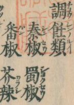蜀椒(ショクセウ)の横に番椒(バン )とあるので、振りかなは「バンセウ」と思います。