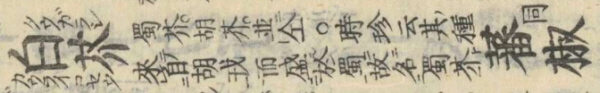 「番椒」に「バンセウ」の振り仮名、俗に「たうがらし」「番椒」は「タウガラシ」の振り仮名はついていません。