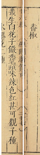 この「番椒」は中国の名称を使ったと思われます。中国で最初に「番椒」が出てくるのは、1591年刊の高濂著『遵生八箋』です。この書物で「畨椒」は花に関連した所に記載。「訓蒙図彙とほぼ同じ位置づけです。