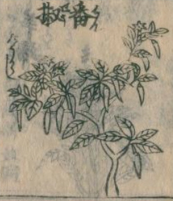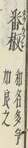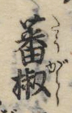 「畨椒(ハンセウ)-花鏡」。 秘伝花鏡. 巻之1-6 / 陳淏子 訂輯 ; 平賀先生 校正に「畨椒 トウガラシ コウライコセウ」があります。