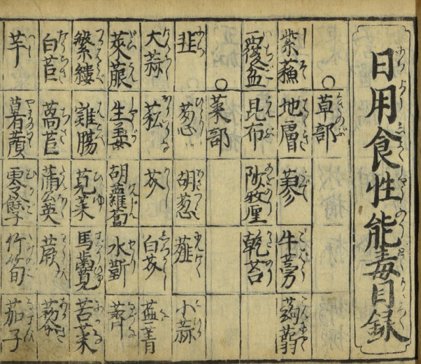 玄朔著の日用食性に、季時珍の本草網目等により、121品目の増補を行い、前書の食性と能毒とを一つにまとめ、食品名の上に出典を挙げ、上・中・下品を示し、多識編 和名鈔により、和名を訂し、そのあとに諸疾宜禁集と日用灸法が付く。初版は万治二年(1659年)以前の刊。