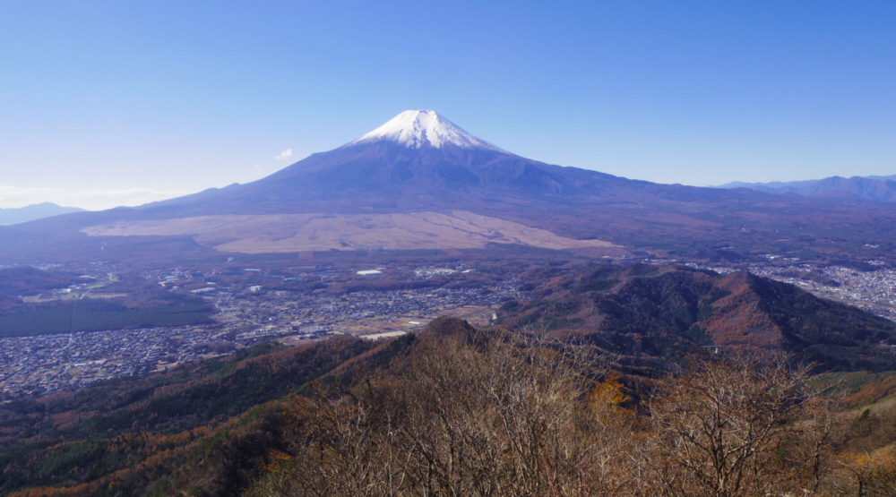 2012.5.7、2016.10.24に登った時は富士山にかなり雲がかかっていた。2016.12.23に登った時は快晴ですばらしい富士山を見ることができた。しかし、杓子山に到着したのが11:55で富士山周辺が少し霞み始めていた。