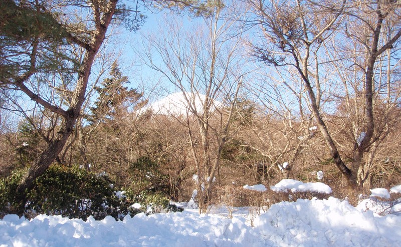 ■13:14 樹木の枝の後に何とか富士山が見える。葉がつくと見えないと思われる。