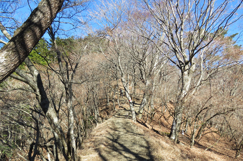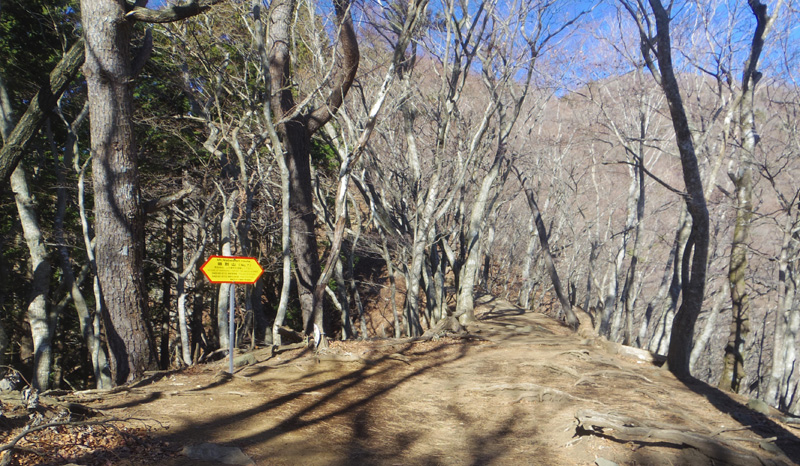 ■6:10 小田急江ノ島線長後駅駅発。 ■7:12 小田急小田原線渋沢駅着 ■7:16-7:32 渋沢駅から大倉バス停までバス。 ![]() ■7:37 大倉バス停から出発。大倉屋の右の道へ進みます。 ![]() ■7:41 表示板「←二股・鍋割山 表丹沢県民の森」に従い、舗装道路から舗装されていない左の細い道へ進みます。 ![]() ■7:50 樹木で囲まれた道を進みます。 ![]() ■8:15 車が通れる林道に出て、二股目指して進みます。気温は0度近くですが、相棒さんは紫のダウンで寒さ対策万全。 ![]() ![]() ■8:48 左下を流れる四十八瀬川(しじゅうはっせがわ)の川音を聞きながら進みます。このなだらかな坂道が長い。大倉から71分間歩いているので、二股が近い。 ![]() ■8:52-9:04 到着、12分休憩。大倉から、約5q、標高差230mを75分。登りの前の足慣らしの道がある良いコースと考えて歩きます。(できれば40分ぐらいでいいのですが。) ![]() ■9;16 二股から後沢乗越へ。快晴の青い空を眺めて進みます。 ![]() ■10:20 本沢の表示板がある、小川を渡ります。 ![]() ■9:25 ここまで、車が入ります。ここが登山道入り口になります。水が入った2リットルボトルが置いてあります。元気な人は、2リットルボトルをリックに入れて、山頂の鍋割山荘まで運びます。69歳で体力に自信がない人は、2リットルボトルをリックに入れません。 ![]() ■9:31 樹木の間にできた坂道を登ります。 ![]() ■9:47 後沢乗越についたかと思うが、後沢乗越はこの先右に曲がって、もう一登りします。 ![]() ■9:50 ジグザグの階段を上ると後沢乗越です。 ![]() ■9:53 後沢乗越に到着。左側が登ってきた道、まっすぐ行くと栗ノ洞、櫟山に行きます。12分休憩。 峠は、登山用語では乗越(のっこし)、または単に越(こえ、こし)などとも言い、山嶺・尾根道に着目した場合は鞍部(あんぶ)、窓、コル(col)とも言います。 後沢乗越は鍋割山と櫟山の間にある鞍部です。 ![]() ■10:06 この急坂が鍋割山への道。出発。 ![]() ■10:19 急坂が続きます。 ![]() ■10:40 登山道にNoがつけられています。ここがNo.7です。 ![]() ■10:39 富士山の山頂部を眺めながら、登山道を進みます。 ![]() ![]() ■10:46 山頂まで.0.8q地点に到着。「鍋割山 0.8q」の表示板。富士山展望地まで20分以上あるので、ここで7分間休憩。 檜洞丸でも、「檜洞丸 0.8q」の表示板があります。「鍋割山 1.0q」だとまだ1qかと思いますが、「鍋割山 0.8q」だとあと0.8qしかないぞと思うのを狙っているようです。 ![]() ![]() ■11:02 登ってきた道を振り返ると、右側に富士山がいます。富士山展望地がもうすぐです。 ![]() ■11:08 鍋割山の富士山展望地です。 登山道の左側に小さな広場があります。表示板がないので、登り道だけみて登っていくと見逃してしまうので、左側を見ながら登っていきます。 ![]() ■11:12 鍋割山の富士山展望地からの富士山がいる大展望。 ここから富士山、愛鷹山、箱根山、相模湾をまとめて眺めることができます。鍋割山山頂では箱根山の左側は樹木で遮られます。 富士山の左側に雲があるため、7分ほど待って雲が少なくなったところで撮影。 ■11:13 鍋割山の富士山展望地からの富士山。 ■11:13 鍋割山の富士山展望地からの富士山。 ■11:14 鍋割山の富士山展望地からの富士山山頂部。 ![]() ■11:14 鍋割山の富士山展望地からの富士山山頂部。 ![]() ■11:30 鍋割山山頂に到着。鍋割山荘が見えます。右側に相模湾を眺める広場があり、その上にトイレがあります。左側は、富士山展望広場です。 ![]() ![]() ■11:32 富士山展望広場です。ここに座って富士山を眺めながら、鍋焼きうどんとおにぎりを食べます。 ![]() ■11:33富士山展望広場からの富士山。 鍋焼きうどんを食べる前に、広場の先のほうに進み、樹木の前から富士山を撮影します。宝永山周辺が雲で隠されていますが、一通り撮影。 ![]() 富士山撮影が終わり、鍋焼きうどんとおにぎりを食べます。街の食堂でもこれほどおいしい鍋焼きうどんは食べられません。 更に富士山の絶景付きなので格別です。(写真は2009.6.9の使用)