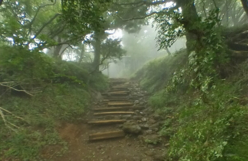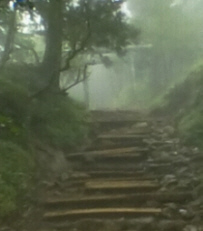 | 27丁目「御中道」鳥居の上から下の階段と右の道(昔のご中道) 富士山は右側 鳥居下の登山道は尾根の中央にあるが掘割状にえぐられた形になっています。 |
