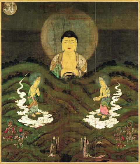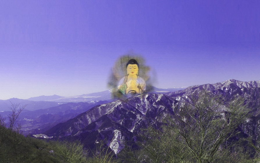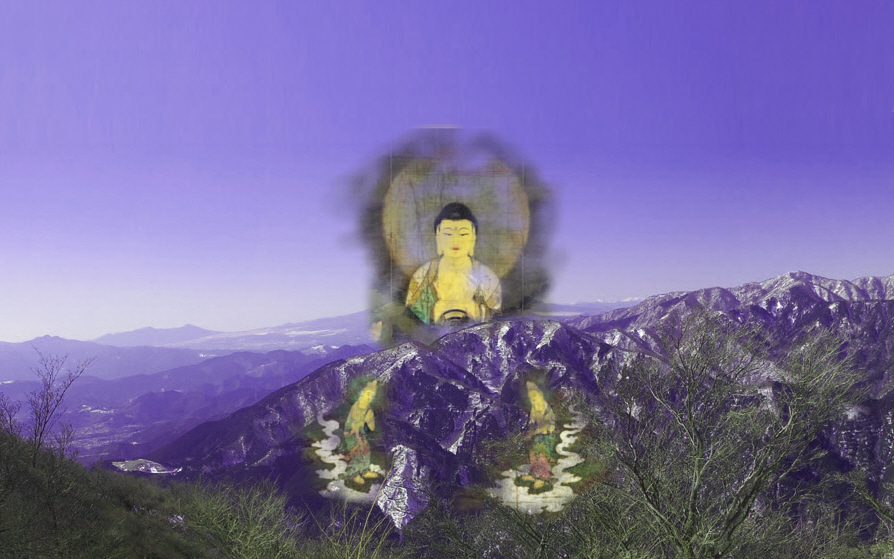 | 阿弥陀仏が丹沢山地の上に富士山 夕暮れとともに阿弥陀仏が富士山に来迎する |