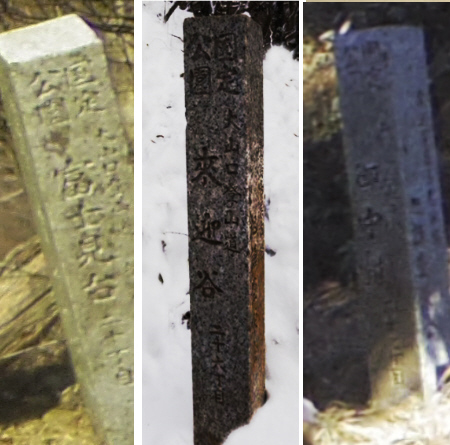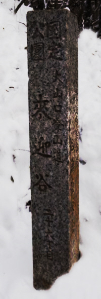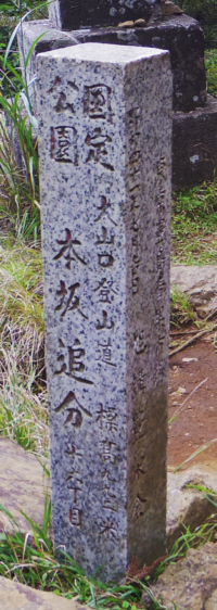 | 「天保十年(1839年)六月 神田三河町四丁目陸天長蔵 取締御師相原但馬」に立てられた石柱「三町目」が現在の石柱「四丁目」の前にある。 明治7年(1874年)3月建立の「十一町目」の石柱が、現在の「十一丁目」の石柱のそばにある。 旧「十三町目」の石柱が、現在の「十二丁目」と「十三町目」の石柱の間にある。 現在の十六丁目「本坂追分」のそばに、「三十六丁目」の石柱があったが、これは蓑毛からのものだろうか。 2016大山(3) - 山と鉄より引用 |