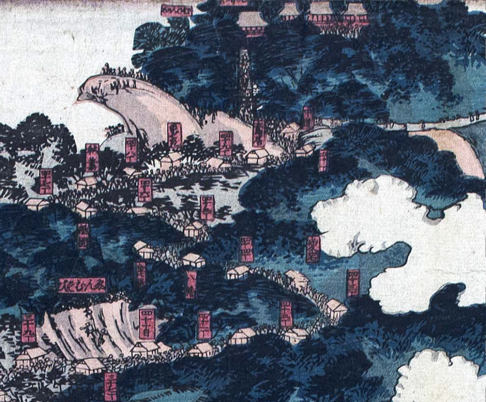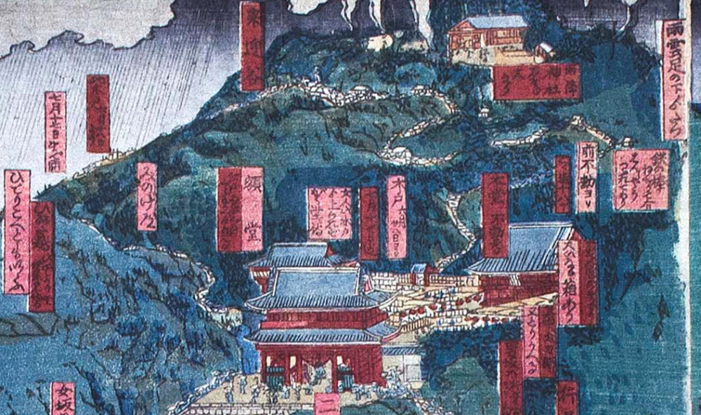 | 作品名:相模州大住郡雨降大山全圖 作者:歌川国芳 種別:浮世絵 時代:江戸時代 位置:全景 |