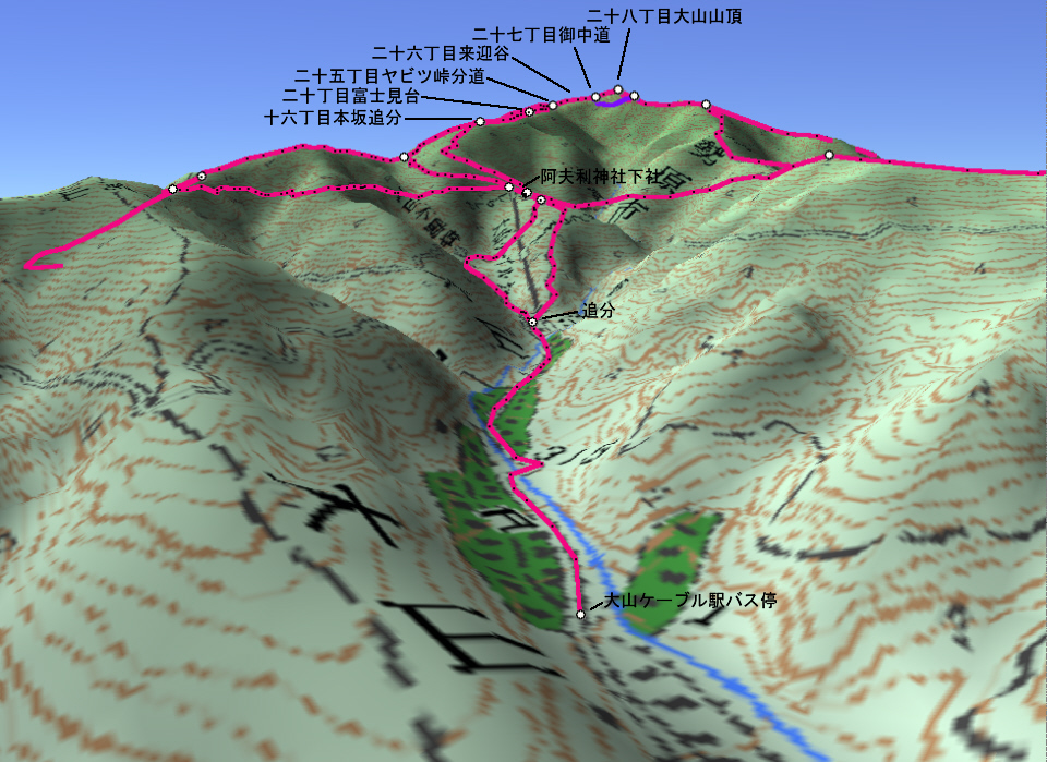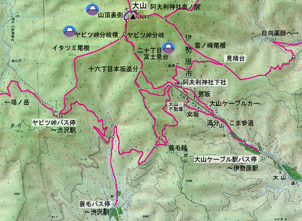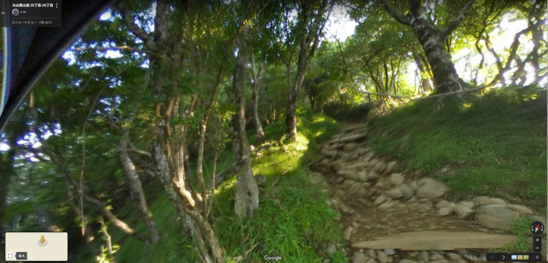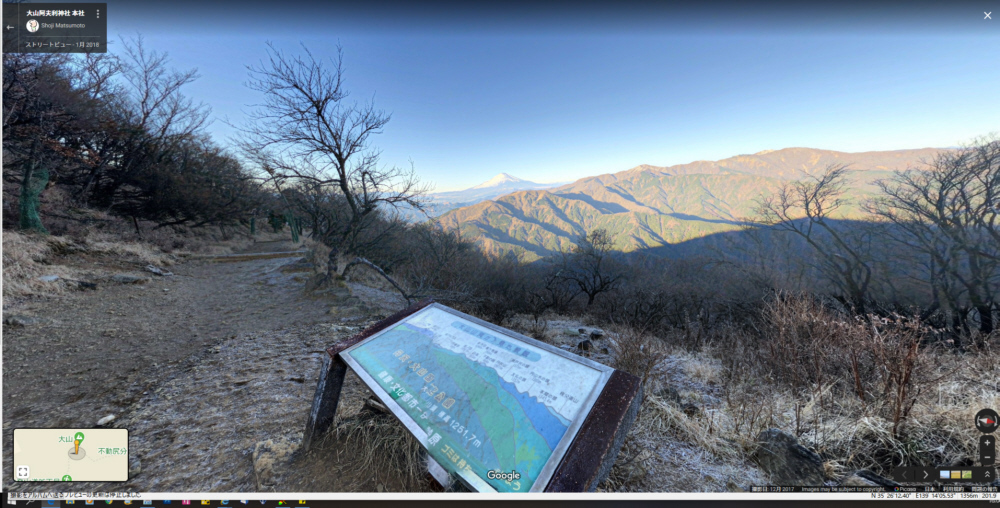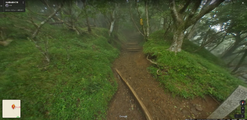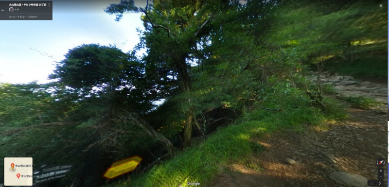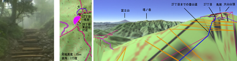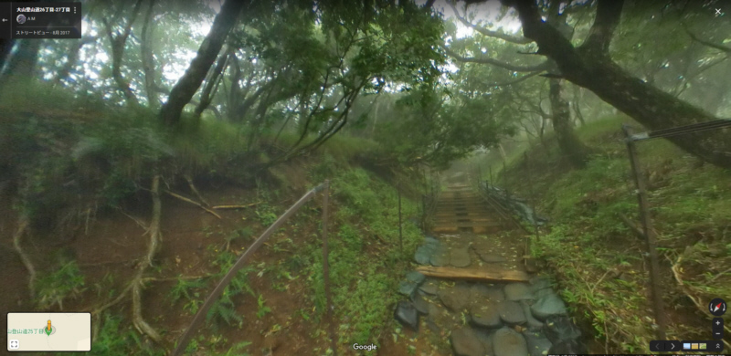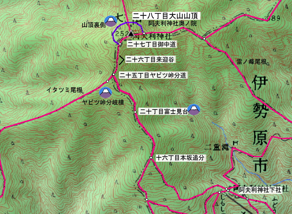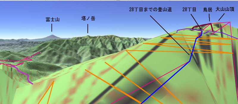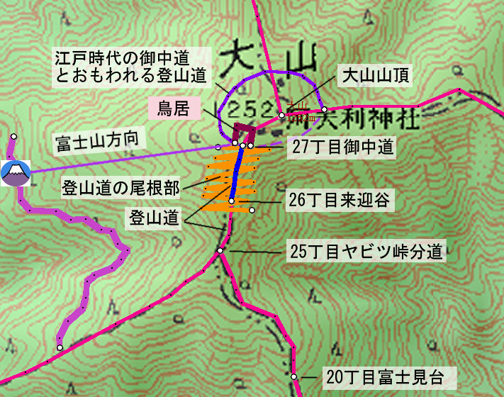 | 大山27丁目「御中道」から25丁目「ヤビツ峠分道」までの登山道と富士山展望(登山道の写真画像はgoogle mapで作成) | |