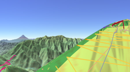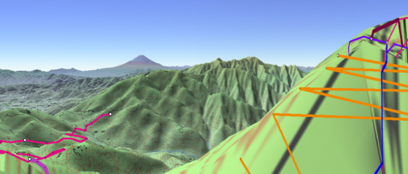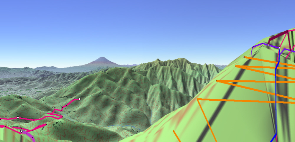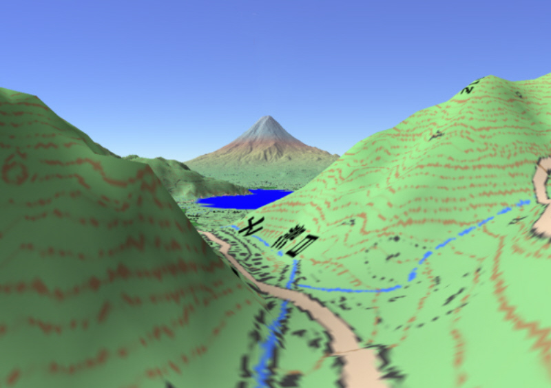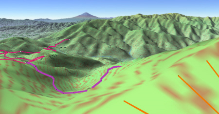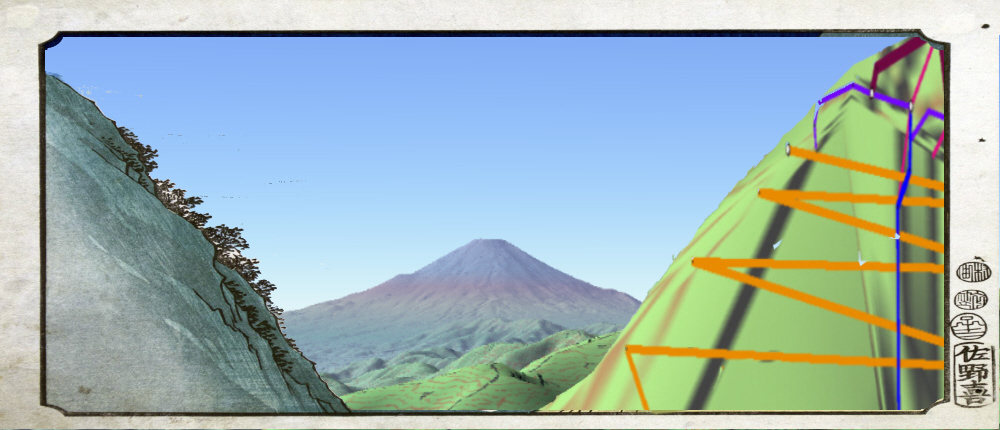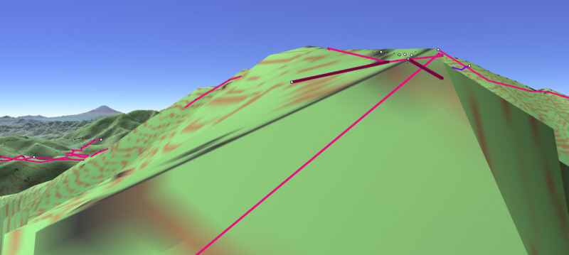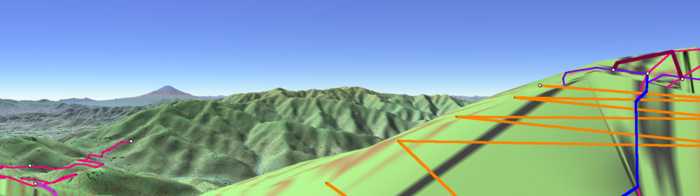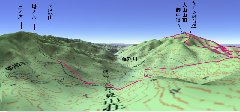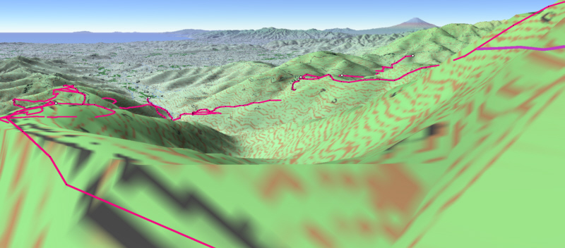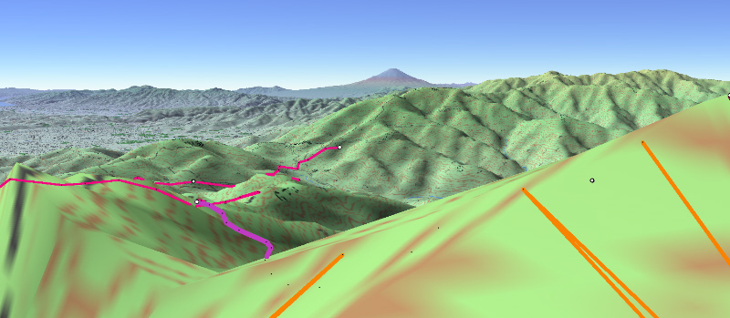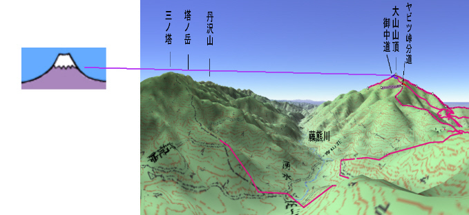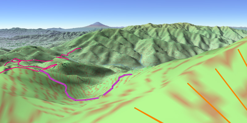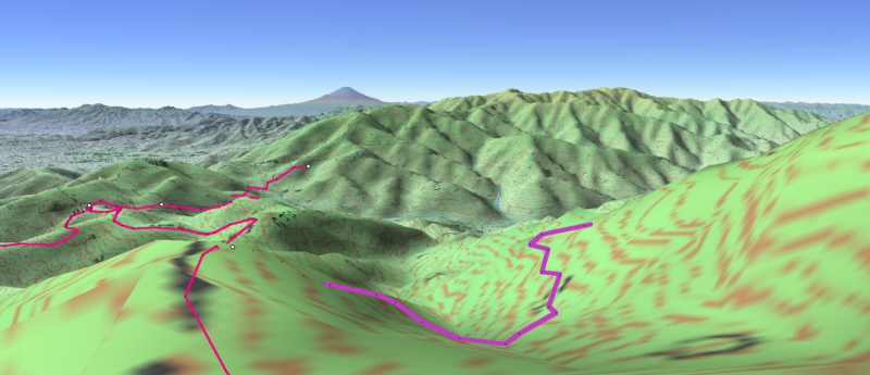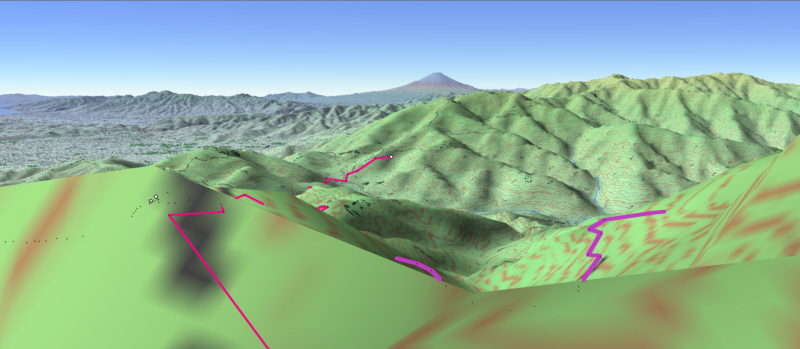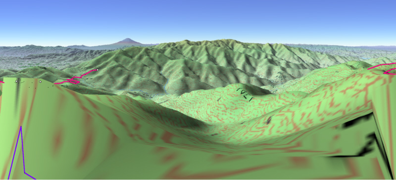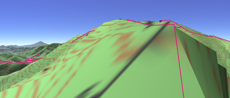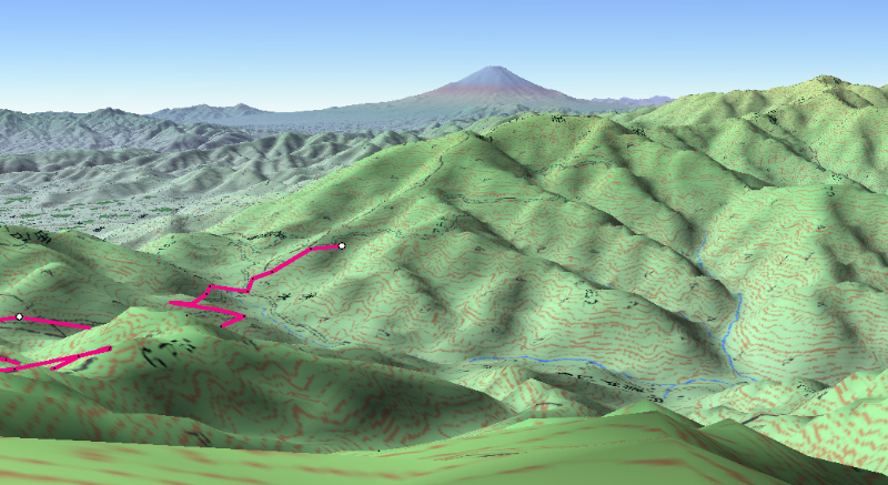 ![]() カシバードで作成。対地高度2m ![]() カシバードで作成。対地高度25m。 カシバードでは近距離(画面下部)の画像作成が難しい。ヤビツ峠分道横の展望地では、対地高度25mの画像のほうが実際の景観と一致。 谷があり富士山が見える「来迎谷」にふさわしい場所です。 25丁目ヤビツ峠分道から27丁目御中道の尾根道はほとんどこのように見えそうです。 |