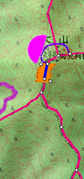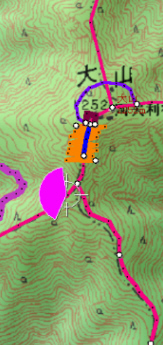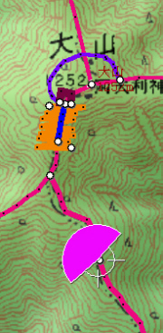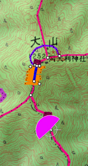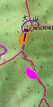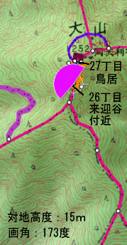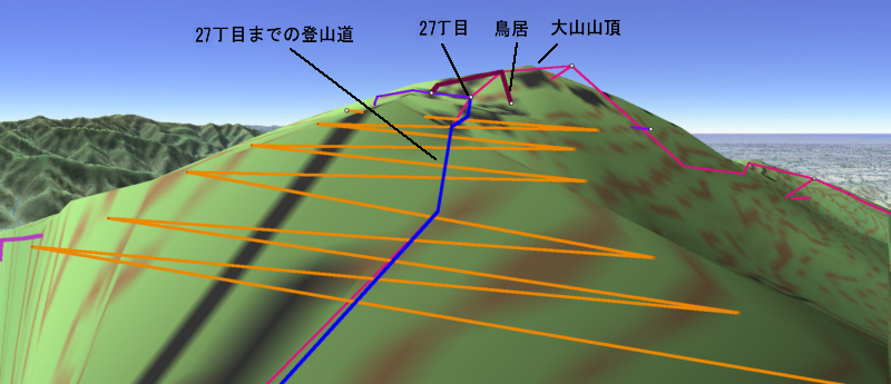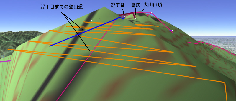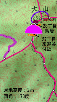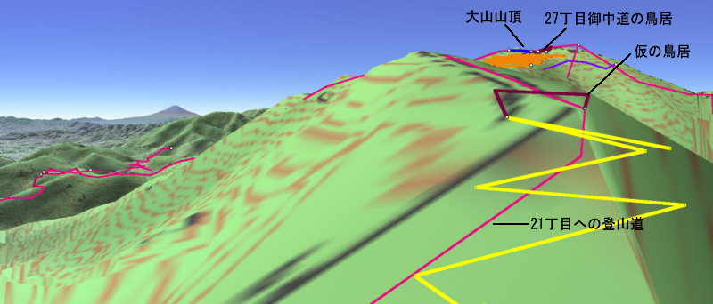 ![]() 27丁目御中道に鳥居の形を書き込み、それを登山道から眺めます。 鳥居は、立体的ではなく地面に書き込んだことになります。 |