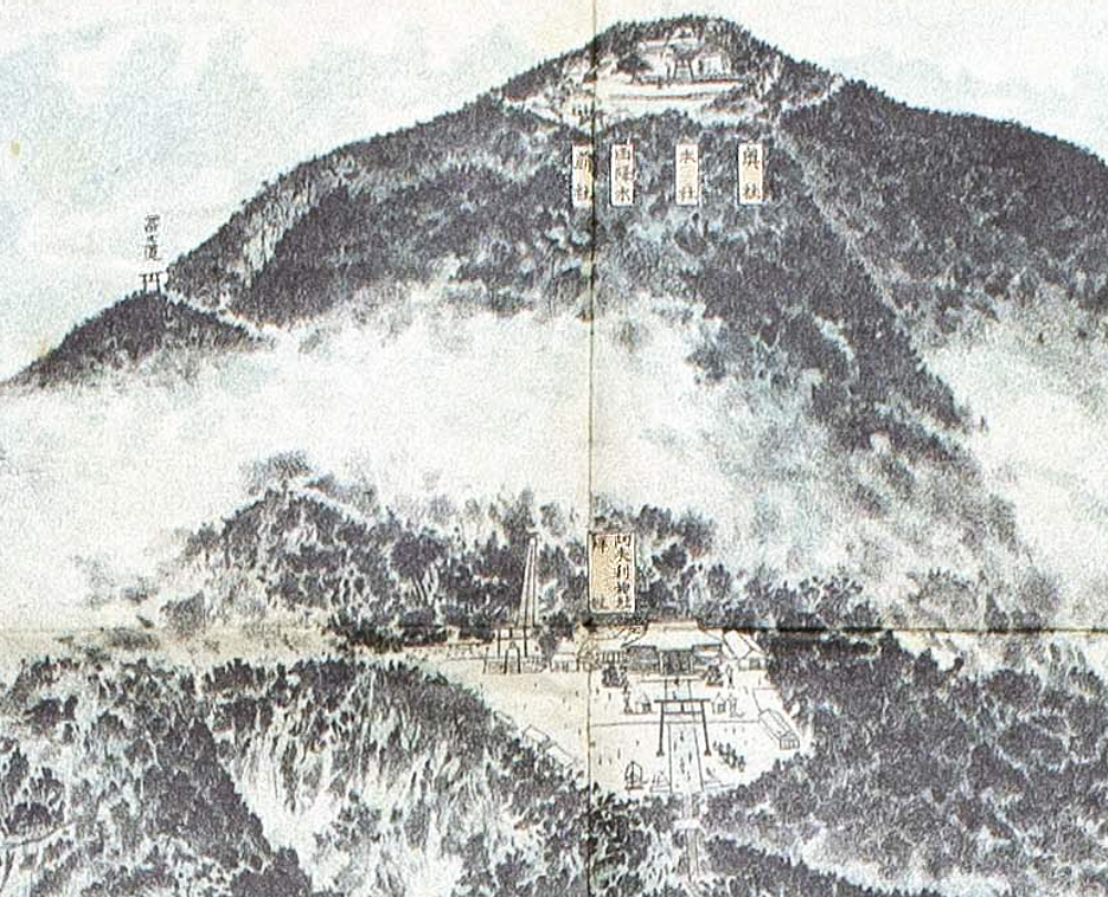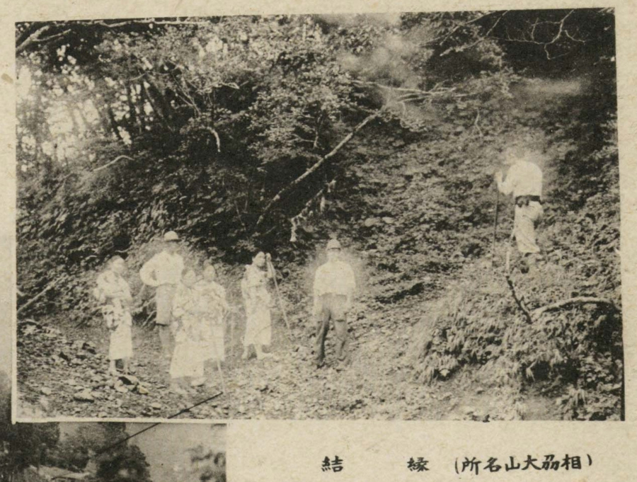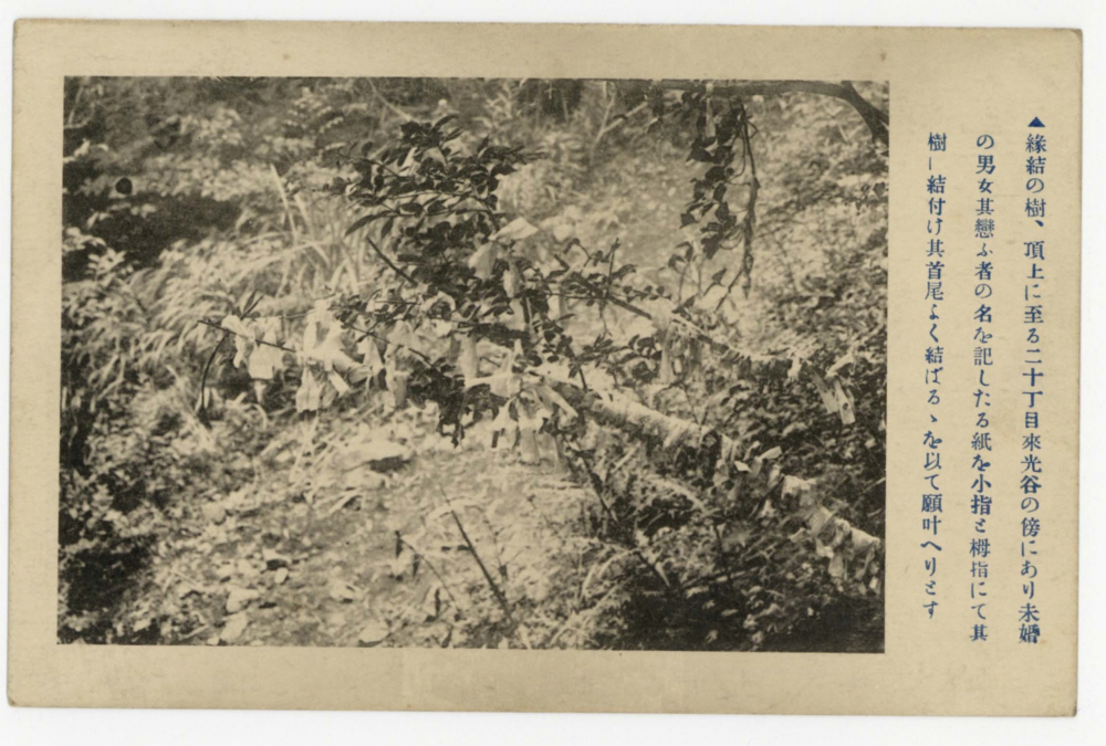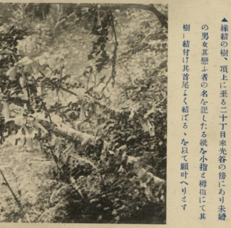 | 『縁結の樹、頂上に至る二十丁目來光谷の傍にあり未婚の男女其戀ふ者の名を記したる紙を小指と栂指にて其樹に結付け其首尾よく結ばるを以て願叶へりとす』 |