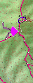 | 25丁目「ヤビツ峠分道」 樹木の枝の奥に丹沢山地があり、その上に富士山が見えます。富士山が見えます。 このあたりの枝を伐採すれば「ヤビツ峠分道」横と同じ景観が出てくると思います。 |