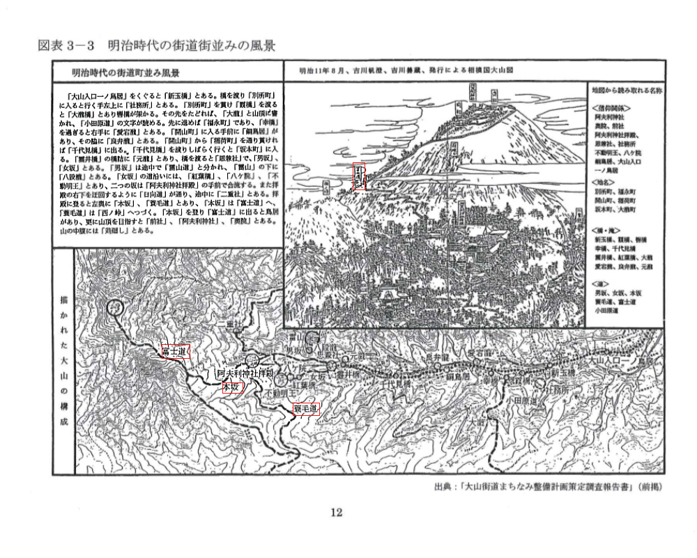 | 5 | 明治11年8月 | 相模國大山圖 | 無し | 阿夫利神社、奥社、前社 | 阿夫利神社〇殿 | 不動明王 | 本坂を登り冨士道に出ると鳥居がある |