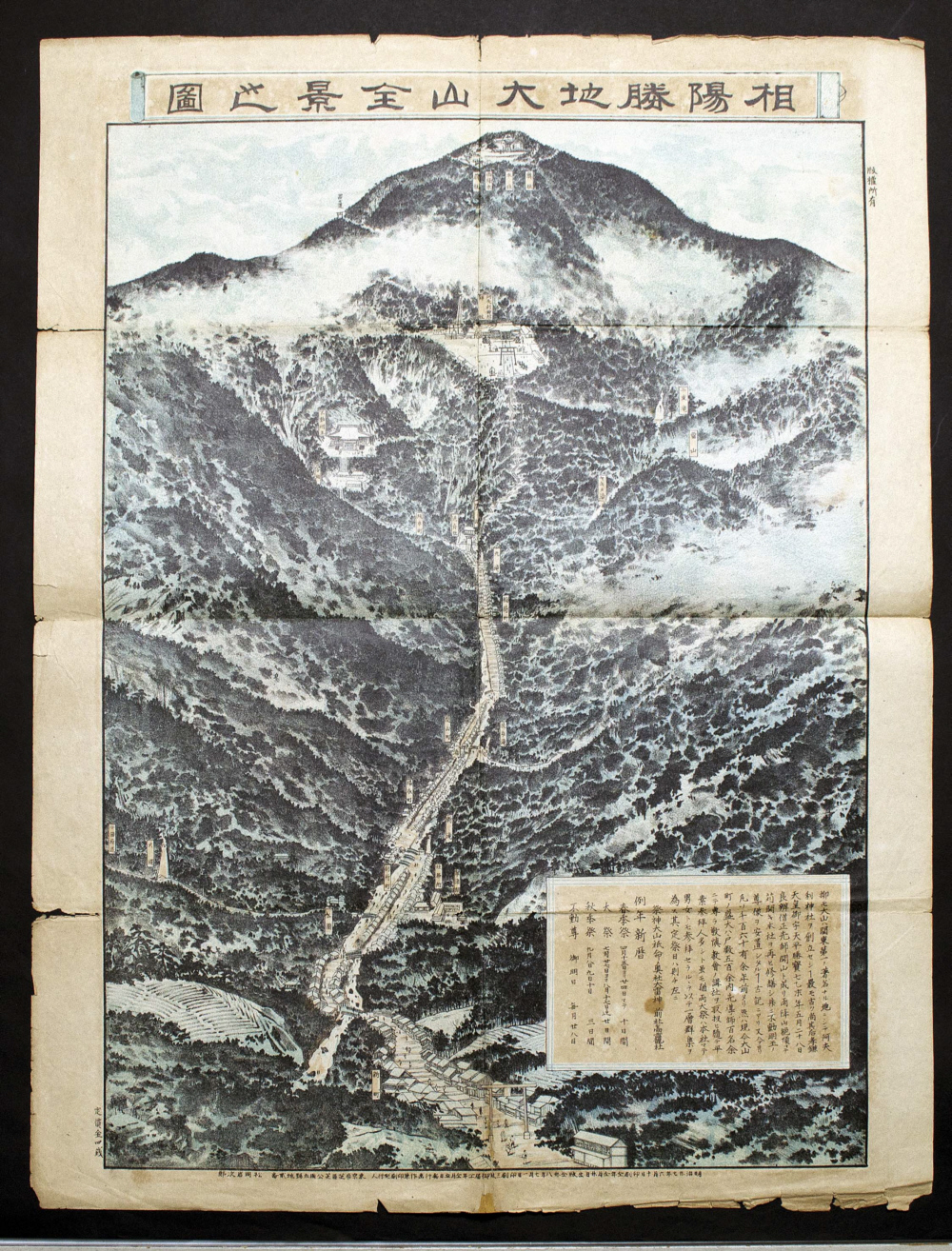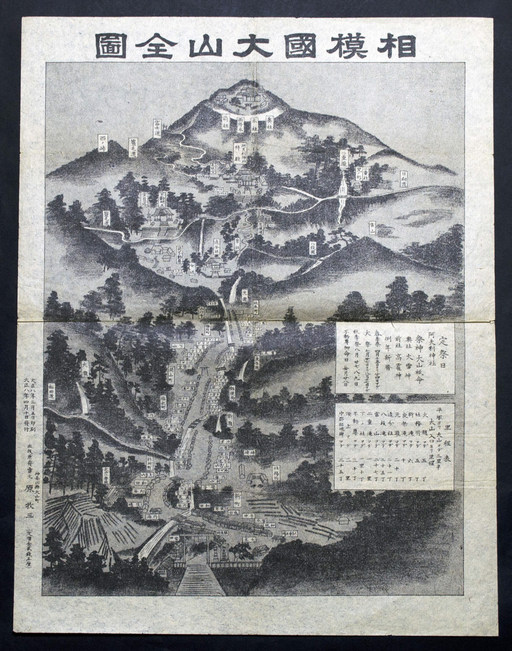 出版者、版元、発行所等:〔不明〕 出版年、撮影日等:大正8(1919)年4月 大きさ:41×31cm ページ:1枚 所蔵:個人蔵、産業能率大学提供 解説: 関東大震災前の大山の様子がわかる |