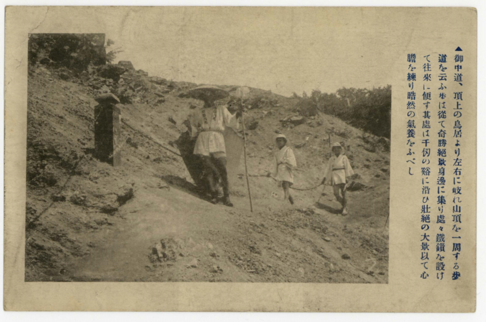 | 作品名 | 『御中道、頂上の鳥居より左右に岐れ山頂を一周する歩道を云ふ歩は從て寄勝絶景身邊に集り處々鐵鎖を設けて往來に便す其處は千仭の谿に沿ひ壯絶の大景以て心膽を練り晧然の氣養をふべし』 |