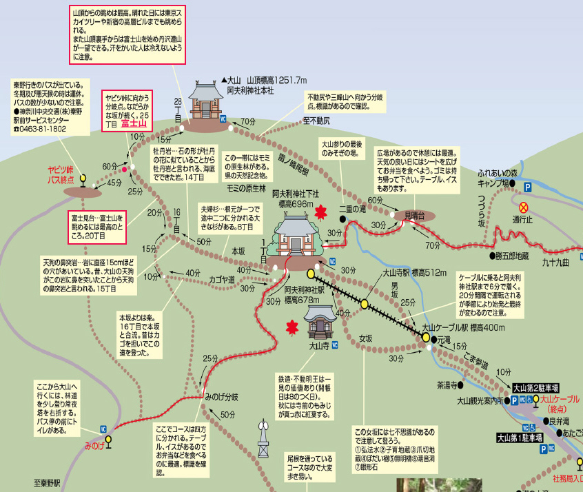 大山ケーブルカーの会社が発行したパンフレット | 無し | 本社 、雨降木 | 阿夫利神社下社 | 不動尊 | 富士山と大山の間の山は丹沢山 |