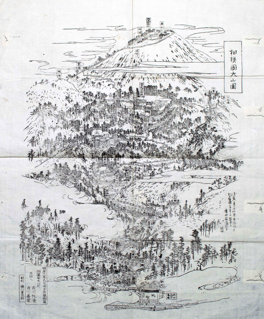 | 作品名:『相模國大山圖』 作者:吉川帆澄 吉川善藏(墨刷)(大山町) 種別:古地図 時代:明治 位置:全景 |