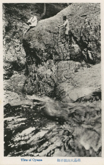 『相刕大山親不知 View of Oyama』 出版年撮影日等:〔不明〕 説(聞き取り): ・この場所は、「お刈廻し」(おかりまわし)にあった「親知らず」である。大きな石があり、道が狭く急で危険な場所であったからこの名が付いたのではないか。 ・なお大山山頂の周囲には、富士山のお鉢巡りのように狭い山道が整備されていた。この道を「お刈廻し」(おかりまわし)、「お中道廻し」と呼んでいた。 ・昭和30年~40年頃までは使われていたが、今は整備されておらず歩くことはできない。 ・そもそもこの道は、火災を防ぐ防火帯の役割を持っていた。 『小林順三氏による「霊岳大山登拝のしおり」(昭和二年六月三十日発行)』 欺くて下社に達し愈々本坂 にかかる。其登口に神門あり、平素閉門し春夏大祭の二期開いて頂上登拝を許す。之れより更に廿八町にして本社に達す。本坂一丁目に老杉對立す高さ十五丈許 り、宛然華表の如く之を鳥居杉といふ。廿四丁より間道を左折すること一二丁にして清泉あり、御神水として供奠す。漸く頂上に達すれば當山特殊の雨降山あ り、常に雨露の點滴するを見る。幹高二丈五尺 周囲九尺許、樹齢四百年を超ゆ、誠に珍奇の靈木なり。和名ブナと称し(又はソバノキ)温帯地方に産す。古昔 の石尊大權現は本社にして,大天狗小天狗(奥社前社)雲表に鎮座す。 奥社より、左折右往して山巓を一周せる道あり、之を御刈廻又は御中道と云ひ、奇景悉く 寸眸の裡に集る。此道の東南面に親不知の險あり。 名勝史蹟 大山道と街並み - 知る | 丹沢・大山 歴史街道ものがたり デジタルアーカイブ |