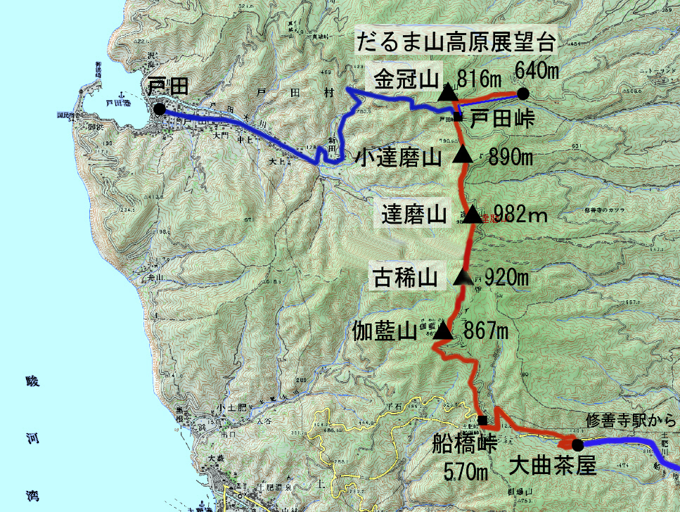 そこから、伽藍山-古稀山-達磨山-小達磨山-戸田峠-金冠山-達磨山高原展望台の山歩きをした。