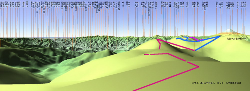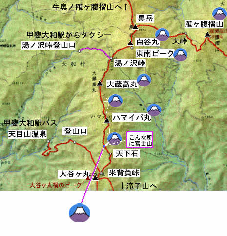 「こんなところに富士山 天下石への下り道」は山頂でないのでここと思われる場所とカシミール図を載せました。