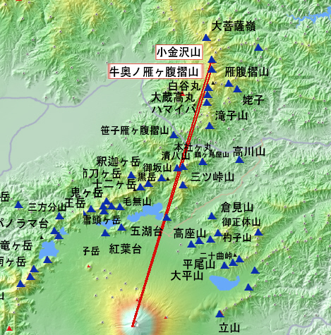 富士山の左裾野は牛奥ノ雁ヶ原摺山、黒岳により一旦途切れますが、その左側は道志、丹沢の山々、更に奥多摩三山、雲取山まで展望は広がります。雲取山と富士山の距離は58km。