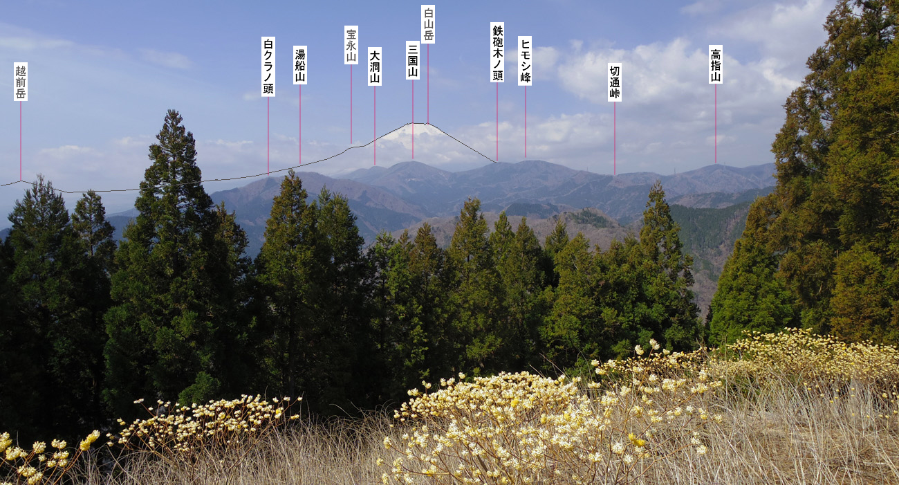ミツバ岳山頂から ミツマタと富士山 & 山座同定 2014年4月1日 10:00