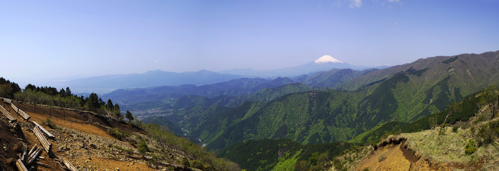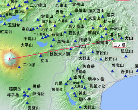 三ノ塔は丹沢山地南東部、神奈川県秦野市にある標高1205mの山で、ヤビツ峠から塔ノ岳へ連なる丹沢表尾根のほぼ中間に位置する山です。そのため、塔ノ岳の表尾根コースの途中の山という位置づけで、塔ノ岳表尾根コースで最も良い富士山展望地ですが、富士山展望の山としての紹介はありません。 しかし、そのゆったりとした山頂広場からの富士山がいる大展望は、他の著名な富士山展望の山からの景観に匹敵します。 富士山の右側には、南アルプス、丹沢山地があり、左側のすそ野は愛鷹山と箱根山地に伸びて相模湾に続く雄大な景観です。 塔ノ岳まで登らなくても、ヤビツ峠-ト三ノ塔-牛首ゲ-大倉バス停のコースで、登り90分の三ノ塔登山を楽しめます。 三ノ塔の山名の由来(三ノ塔 - Wikipedia): そのむかし、毎夜横野の山に光るものが現れていた。それを不思議に思った村人が登ってみると、天空に突然御神燈が光り、その後、奥の山上にも二つ目、三つ目と神燈が灯り始めた。そして竜馬に乗った神童が現れて、村人へ神像を渡し、祀るよう伝えた。村人は神燈が最初に灯った場所(一ノ燈)に加羅古神社を建立し、二番目、三番目に神燈が灯った山はそれぞれニノ燈(にのとう)、三ノ燈(さんのとう)と呼ばれるようになった。その後、「燈」が「塔」に転訛し、現在の名前になったといわれている。 ■参考コース&時間